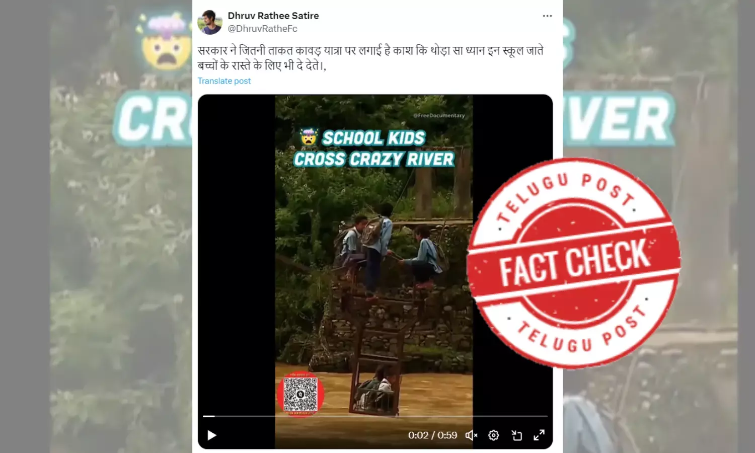Heavy rains have been lashing various parts of India causing widespread flooding, forcing evacuation of several people. Social media is filled with images and videos showing flooding in many prominent cities. Meanwhile, a video shows a group of children wearing school uniforms, taking risk and crossing the river using a pulley cable. This video is shared with a caption in Hindi: “सरकार ने जितनी ताकत कावड़ या