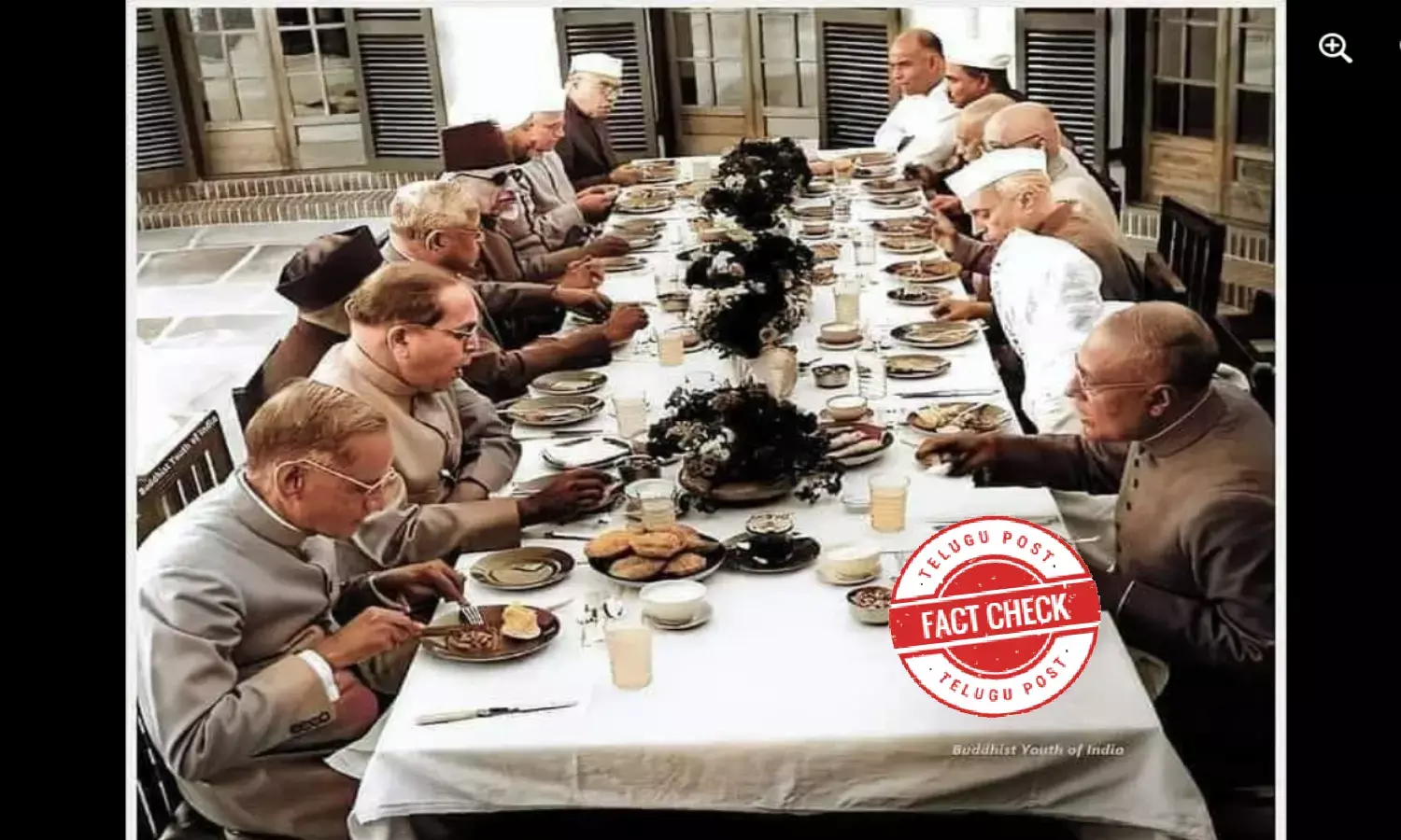 An image of former Prime Minister of India Jawaharlal Nehru and other leaders eating at a dining table is going viral with a claim that it shows us the first Iftar party given by the Congress government in honour of Maulana Abul Kalam. Maulana Abul Kalam was the Education Minister in Nehru’s Cabinet. In the image, we can see Dr. Ambedkar, President Dr. Rajendra Prasad, V K Krishna Menon and others.