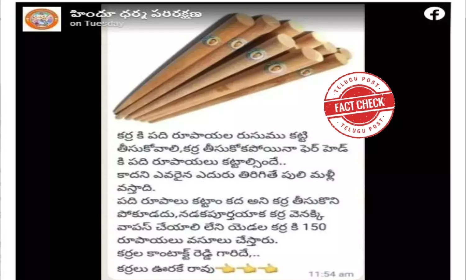 The social media users are sharing a photo of sticks with the following description: “They are doing business with the pilgrims trekking to Tirumala. Devotees should pay Rs 10 per head irrespective of taking the stick. If someone opposes the move, they will witness a tiger. The pilgrim cannot take the stick home, just because he had paid Rs 10. After completing the trekking, they should return it to the authorities. Else, they would be forced to cough up Rs 150 per stick. The contract for providing sticks to pilgrims was given to a Reddy. Sticks will not be provided free of cost.”