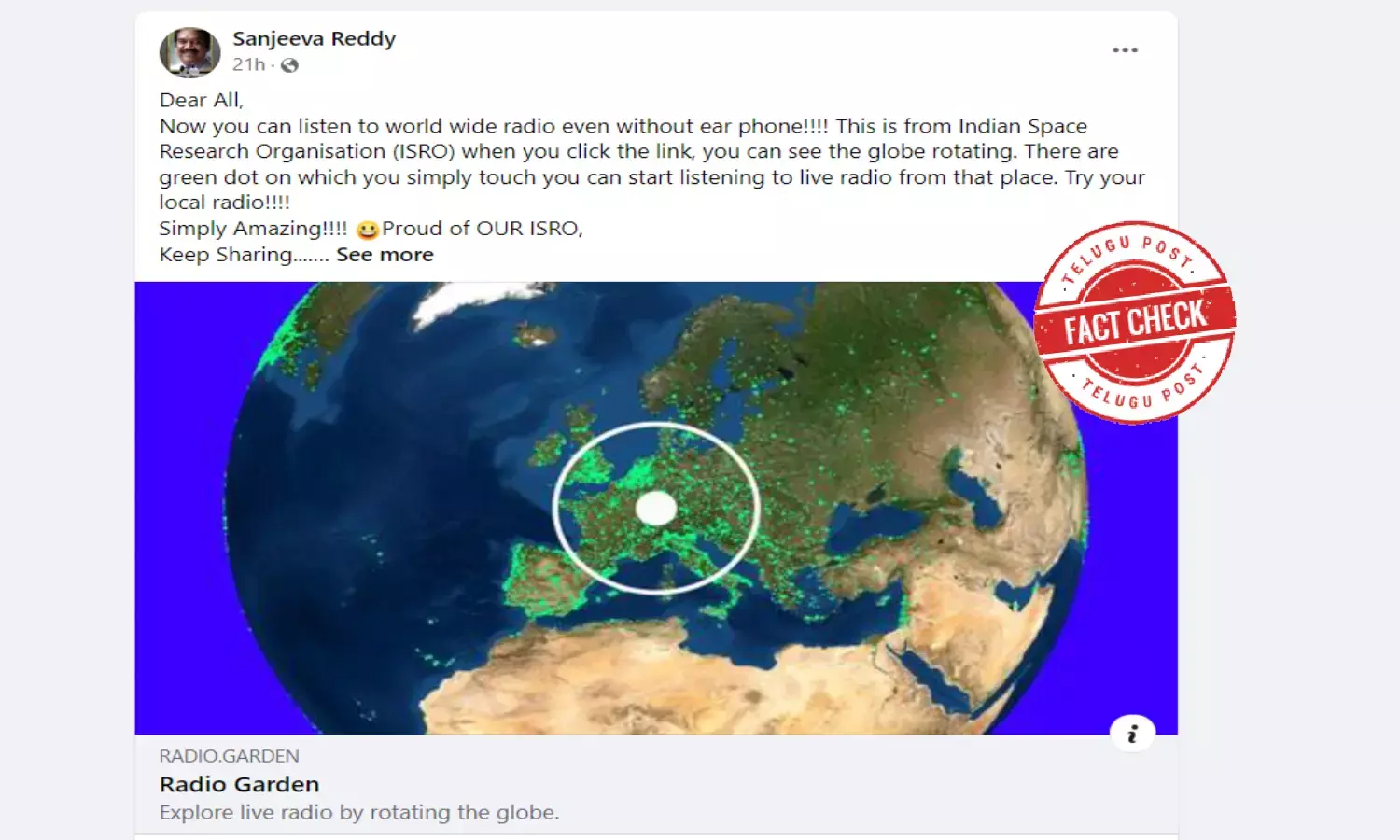 A message sharing a link to radio.garden is being shared virally on Whatsapp and also by a few users on Facebook with a claim that ISRO has developed a portal to listen to live radio from anywhere in the world. The viral post goes “Dear All, Now you can listen to worldwide radio even without earphones!!!! This is from Indian Space Research Organisation (ISRO) when you click the link, you can see the globe rotating. There are green dots on which you simply touch you can start listening to live radio from that place. Try your local radio!!!!