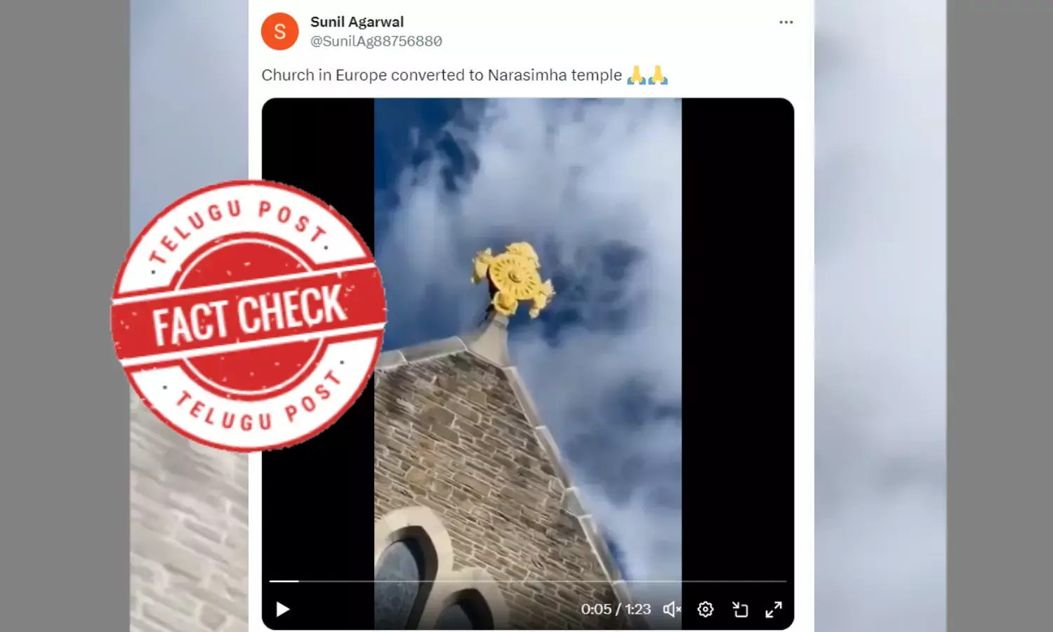 A video showing an old church being converted to a temple and the inauguration of Narasimha Swamy temple is being shared virally on social media with the claim that it shows ‘Church converted to Narasimha Swamy Temple in Europe’. The video shows the cross on the Church being replaced by the Hindu symbol “Chakra” and Hindu acharyas performing traditional rituals inside and outside the building during the consecration ceremony.