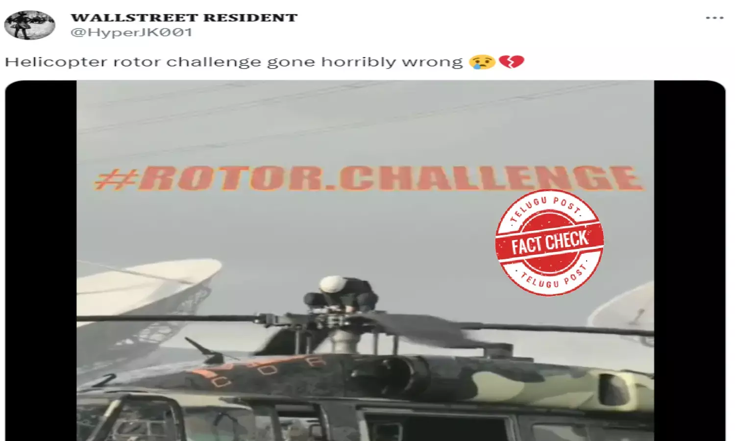 A video of a man standing on a spinning helicopter's rotor and later being flung into the air is viral on social media as netizens believe that this is a real incident and shows an extraordinary stunt called 'rotor challenge' performed by the man.