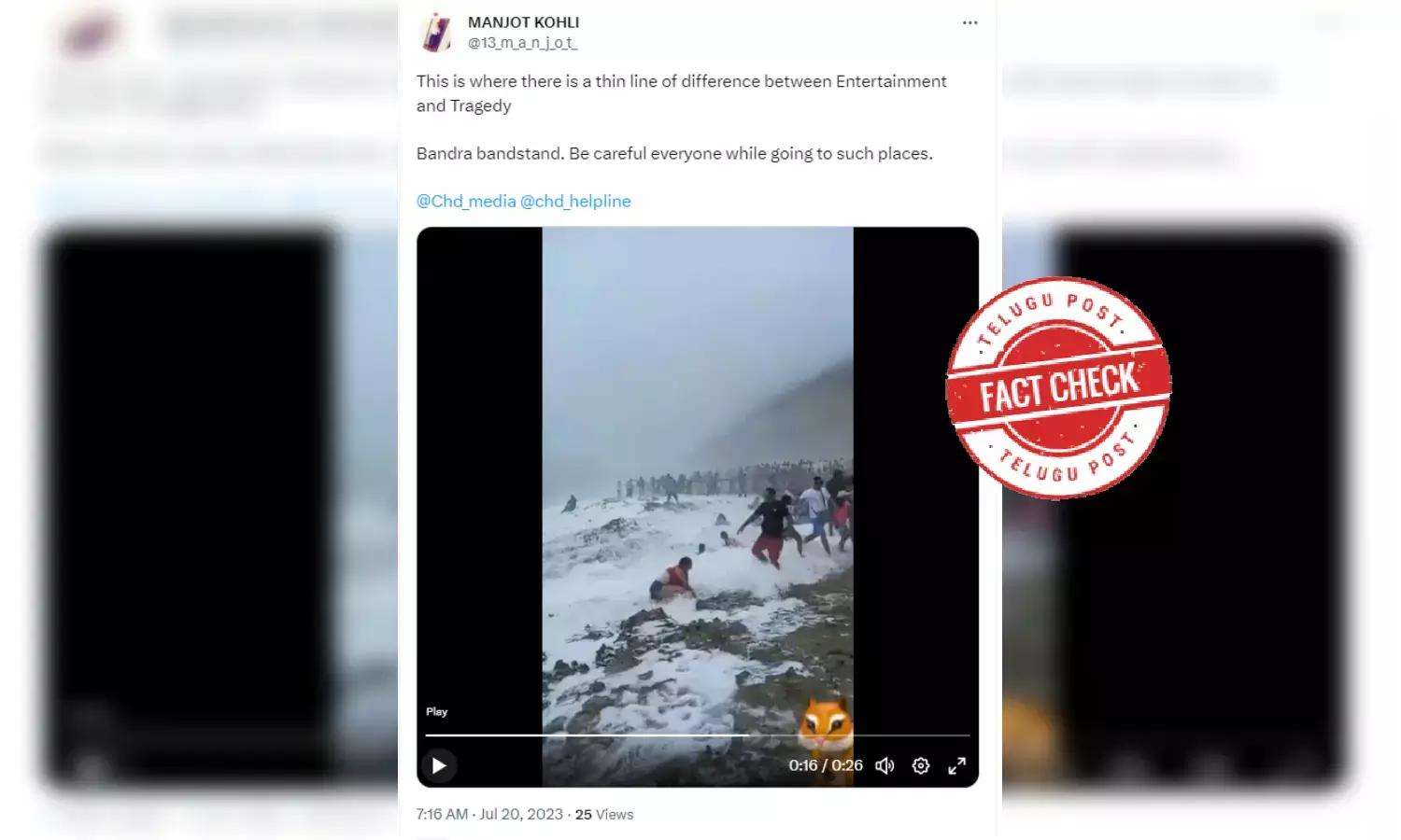 The video shows people enjoying high tides at a beach when a huge wave sweeps away a few people, leaving those nearby as mere spectators. This video is shared with the caption: “This is where there is a thin line of difference between Entertainment and Tragedy Bandra bandstand. Be careful everyone while going to such places.”