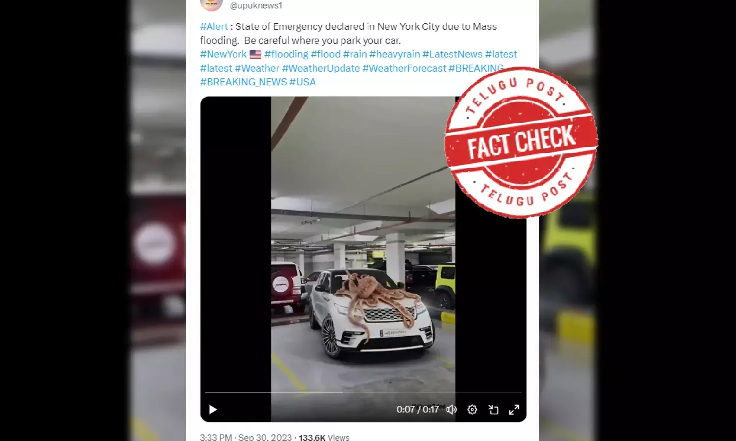 In the last week of September 2023, heavy rains led to the flooding of several parts in New York City. The streets of the city were flooded. Meanwhile, a video of a huge octopus crawling onto a car and crushing it has gone viral on social media with the claim that it took place in a car parking lot in New York city because of the recent flash flooding.