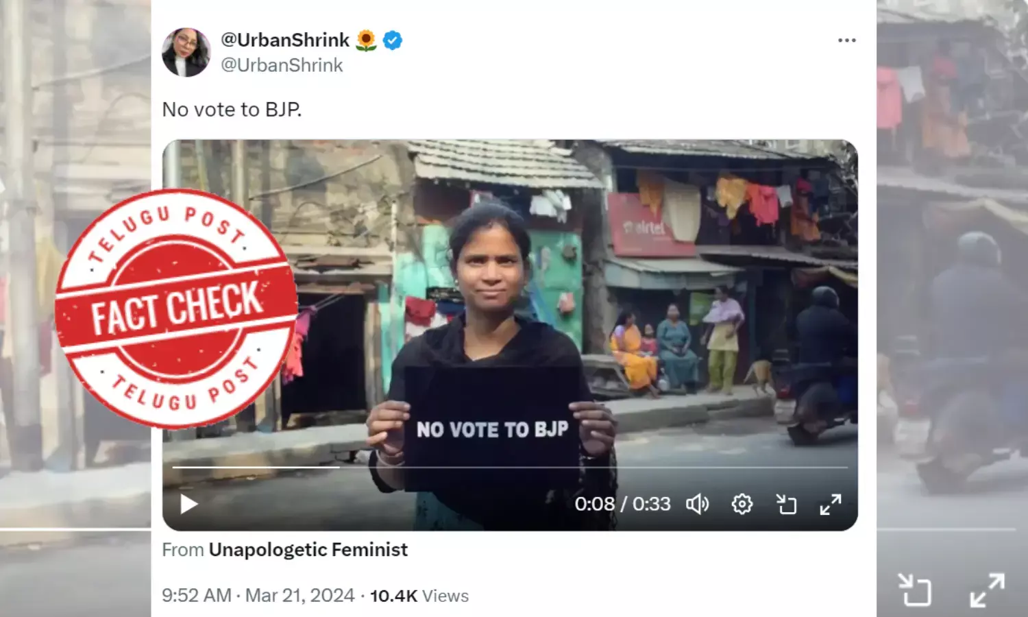 కొన్ని పార్టీలు ఇప్పటికే అభ్యర్థులను ఎంపిక చేయగా.. మరి కొన్ని పార్టీలు అభ్యర్థులను ప్రచారంలోకి దింపేశాయి. ఇలాంటి సమయంలో తప్పుడు వాదనలతో అనేక చిత్రాలు, వీడియోలు సోషల్ మీడియాలో వైరల్ అవుతూ ఉన్నాయి. "బీజేపీకి ఓటు వేయవద్దు" అనే ప్లకార్డులను పట్టుకున్న ప్రజలకు సంబంధించిన వీడియో ఒకటి సోషల్ మీడియాలో వైరల్ అవుతూ ఉంది. "#NoVoteToBJP" అనే శీర్షికతో వైరల్ వీడియోను షేర్ చేస్తున్నారు.
