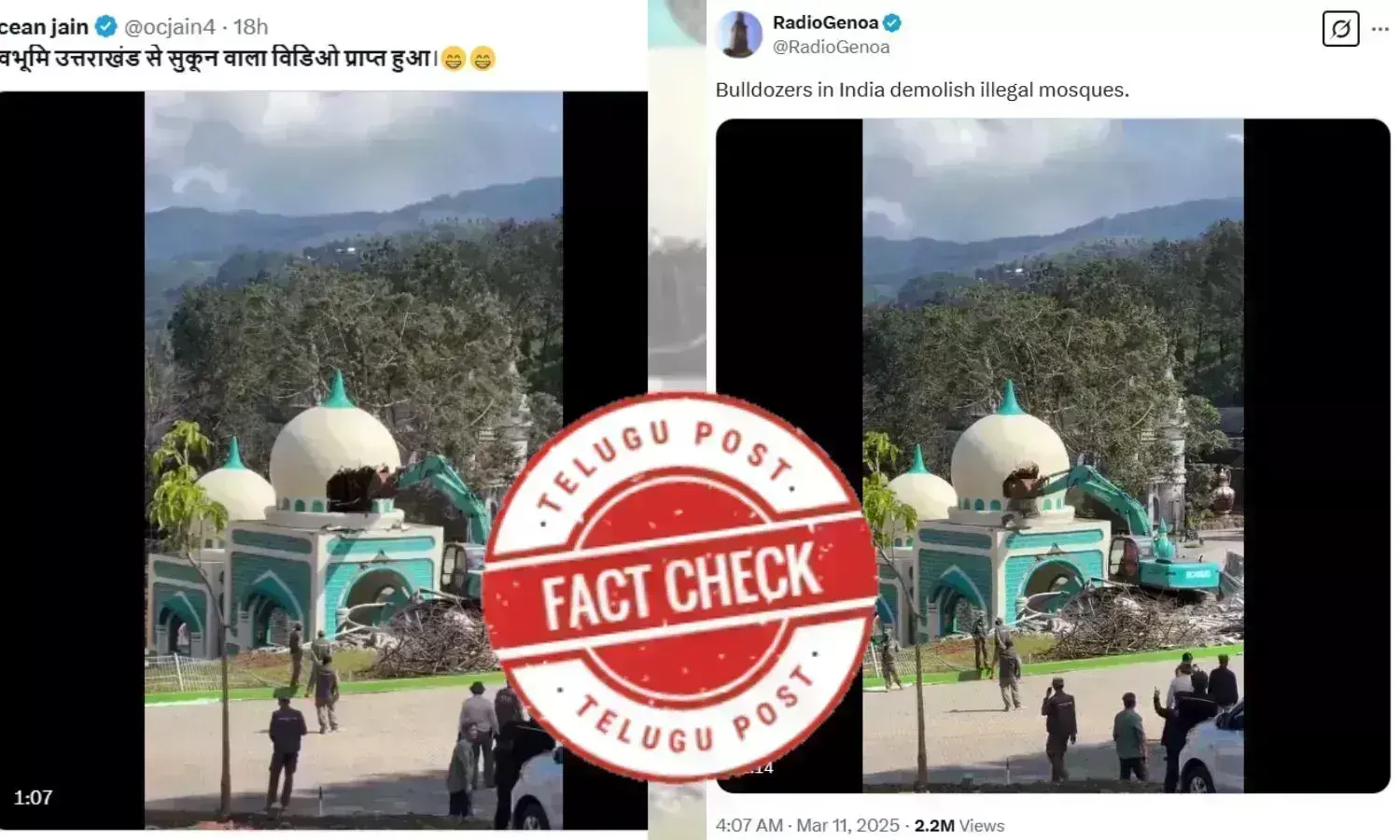 Meanwhile, the demolition of a mosque-like structure is in circulation on social media with a claim that the demolition occurred in Uttarakhand. Some X users shared this video with the caption in Hindi: “देवभूमि उत्तराखंड से सुकून वाला विडिओ प्राप्त हुआ।“ When translated, it claims that the video was received from the holy land of Uttarakhand.