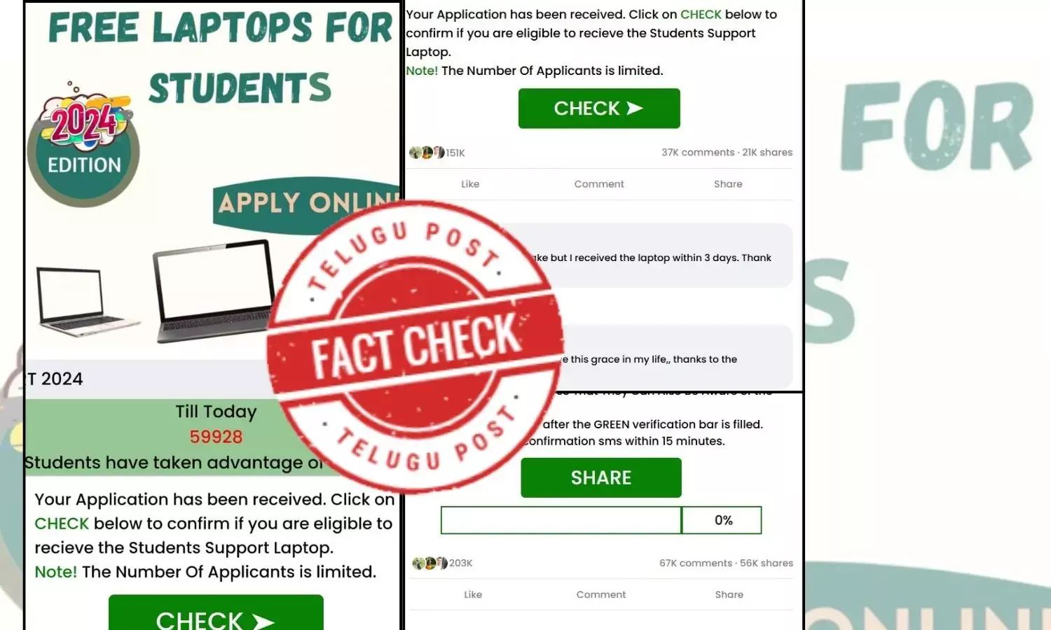 వివిధ రాష్ట్రాలు ఉచిత ల్యాప్టాప్ యోజన 2024ని తమ తమ సామర్థ్యాన్ని బట్టి ప్రారంభించాయి. రాష్ట్రంలోని విద్యార్థులు ఈ పథకాల ద్వారా లబ్ధి పొందవచ్చు. ఈ ఉచిత ల్యాప్టాప్లను సాధారణంగా రాష్ట్రాలు అర్హులైన ప్రతిభావంతులైన విద్యార్థులకు అందజేస్తాయి. ఉత్తరప్రదేశ్, రాజస్థాన్ మొదలైన రాష్ట్రాలు ఈ పథకాన్ని అమలు చేస్తున్నయి, ప్రతి సంవత్సరం విద్యార్థులకు ల్యాప్టాప్లను అందిస్తాయి. అయితే ప్రామాణికమైన పథకాలు విద్యార్థులకు చేరకపోగా, సోషల్ మీడియాలో ఉచిత ల్యాప్టాప్లు ఇస్తున్నాం అంటూ తప్పుడు సందేశాలు ఎక్కువయ్యాయి. వెబ్సైట్ లింక్ ను షేర్ చేస్తున్న వాట్సాప్ సందేశం ఒకటి వైరల్గా షేర్ అవుతోంది.