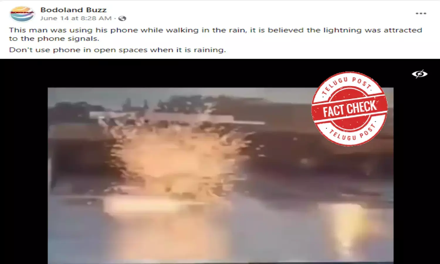 ఫోన్లు మెరుపులను ఆకర్షించగలవని వీడియో వైరల్ అవుతోంది. అందుకు సంబంధించిన సాక్ష్యమిదే అంటూ పలువురు పోస్టులు పెడుతూ ఉన్నారు. వైరల్ వీడియోలో ఒక వ్యక్తి వర్షం కురుస్తున్న వీధిలో గొడుగుతో నడుస్తున్నట్లు చూపిస్తుంది.. అతని మీదకు అకస్మాత్తుగా మెరుపు లాంటిది వస్తుంది. చిన్నపాటి పేలుడు సంభవించి.. ఆ వ్యక్తి తరువాత స్పృహ కోల్పోయి నేలపై పడి ఉన్నాడు.