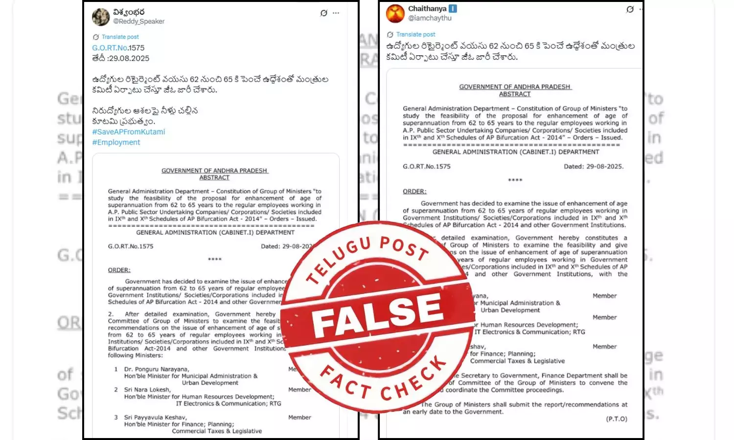 ప్రభుత్వం కూడా అధికారికంగా స్పష్టం చేస్తూ “పబ్లిక్ సెక్టార్ అండర్ టేకింగ్ కంపెనీలు, కార్పొరేషన్లు, సొసైటీలలో పని చేసే ఉద్యోగుల పదవీ విరమణ వయసును 62 నుండి 65 సంవత్సరాలకు పెంచుతున్నట్లు ఒక నకిలీ జీఓ సృష్టించబడింది. ఆ జీఓ RT.NO.1575, తేదీ 29.08.2025 తప్పుడు జీఓ. అసలు జీఓ RT.NO.1545, తేదీ 22.08.2025 మాత్రమే నిజమైనది. ఇందులో 60 నుండి 62 సంవత్సరాలకు పెంచినట్లు మాత్రమే ఉంది. తప్పుడు జీఓలు సృష్టించి ప్రచారం చేసే వారిపై కఠిన చర్యలు తీసుకుంటాం” అని అధికారిక ఫ్యాక్ట్ చెక్ ట్విట్టర్ ఖాతా FactCheck.AP.Gov.in ద్వారా హెచ్చరించింది