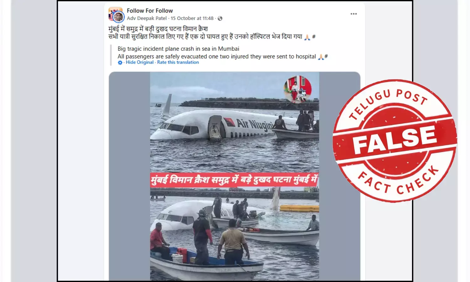 చాలా మంది సోషల్ మీడియాలో, ముఖ్యంగా ఫేస్ బుక్ లో మునిగిపోయిన విమానం, దాని చుట్టూ ఉన్న రెస్క్యూ పడవలను చూపిస్తున్న ఒక చిత్రాన్ని షేర్ చేస్తున్నారు. ఇది ముంబైలో ఇప్పుడు జరిగిన విమాన ప్రమాదం అంటూ ప్రచారం జరుగుతోంది.