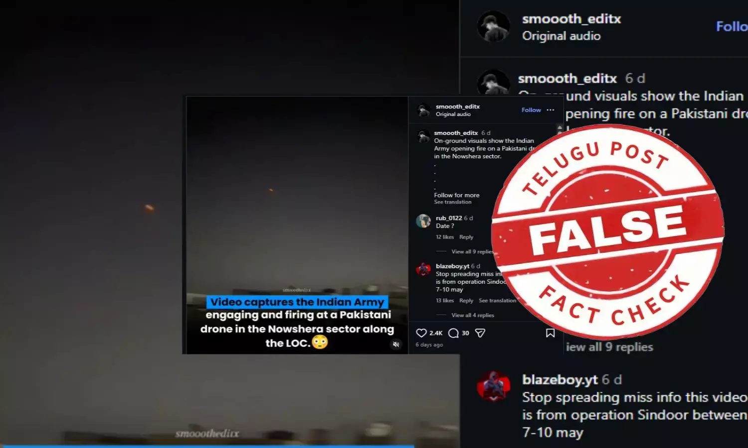 ఇటీవల నౌషెరా సెక్టార్లో భారత సైన్యం ఒక పాకిస్తాన్ డ్రోన్ను కూల్చివేసినట్లు పేర్కొంటూ, రాత్రిపూట ఆకాశంలో ఎగురుతున్న పలు డ్రోన్లను తూటాలతో కుప్పకూల్చే వీడియో సోషల్ మీడియాలో వైరల్గా మారింది. నియంత్రణ రేఖ వెంబడి డ్రోన్ చొరబాటుకు భారత దళాలు స్పందించిన దృశ్యాలను గ్రౌండ్ ఫుటేజ్గా అభివర్ణించిన అనేక మంది సోషల్ మీడియా వినియోగదారులు ఈ క్లిప్ను షేర్ చేశారు. జమ్మూ కాశ్మీర్లోని పలు ప్రాంతాల్లో పాకిస్తాన్ డ్రోన్ కార్యకలాపాలు జరుగుతున్నాయనే వాదనతో ఈ పోస్ట్ వెలుగులోకి వచ్చింది.