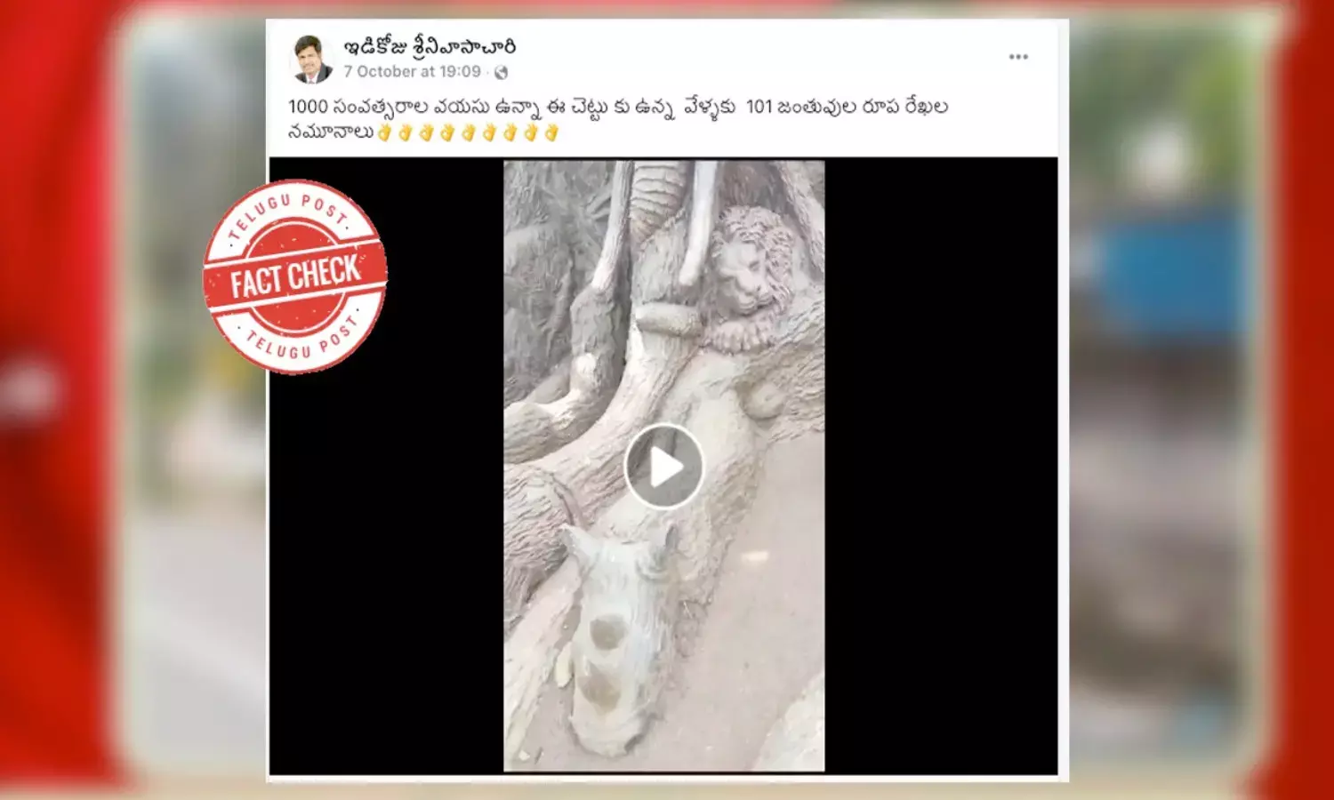 "1000 సంవత్సరాల వయసు ఉన్నా ఈ చెట్టు కు ఉన్న వేళ్ళకు 101 జంతువుల రూప రేఖల నమూనాలు" అంటూ పోస్టులు పెడుతున్నారు.