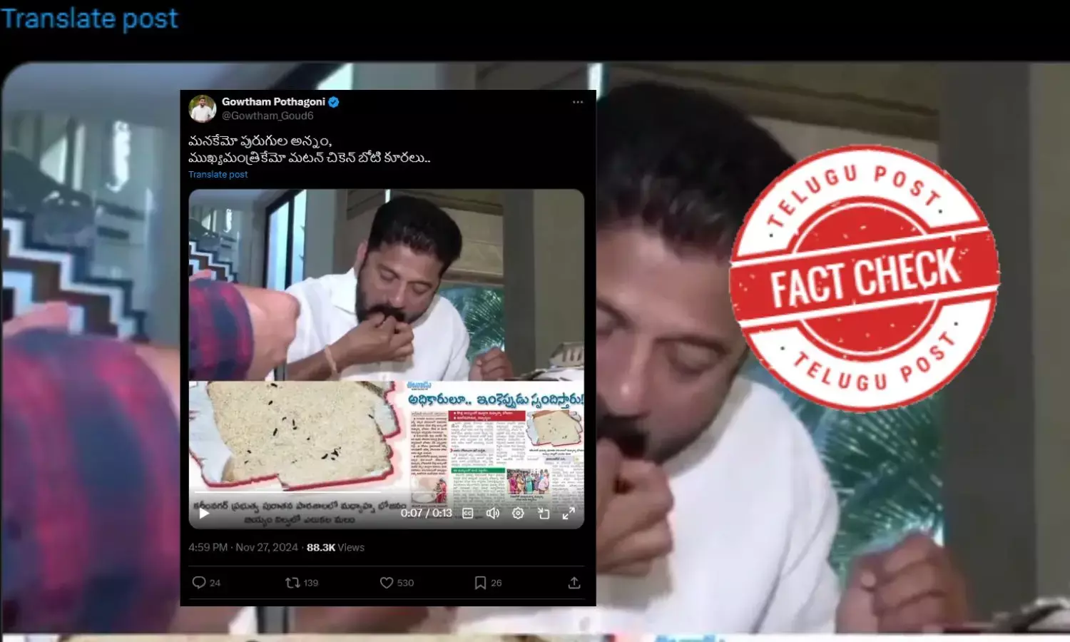 ఇంతలో తెలంగాణ ముఖ్యమంత్రి రేవంత్ రెడ్డి తన టేబుల్ మీద రకరకాల వంటకాలతో భోజనం చేస్తున్న వీడియో సోషల్ మీడియాలో వైరల్ అవుతూ ఉంది. విద్యార్థులకు నాణ్యమైన ఆహారం పెట్టకుండా ప్రభుత్వ పెద్దలు మాత్రం అద్భుతమైన భోజనాన్ని తింటున్నారని ఆరోపిస్తూ పోస్టులు పెడుతున్నారు.