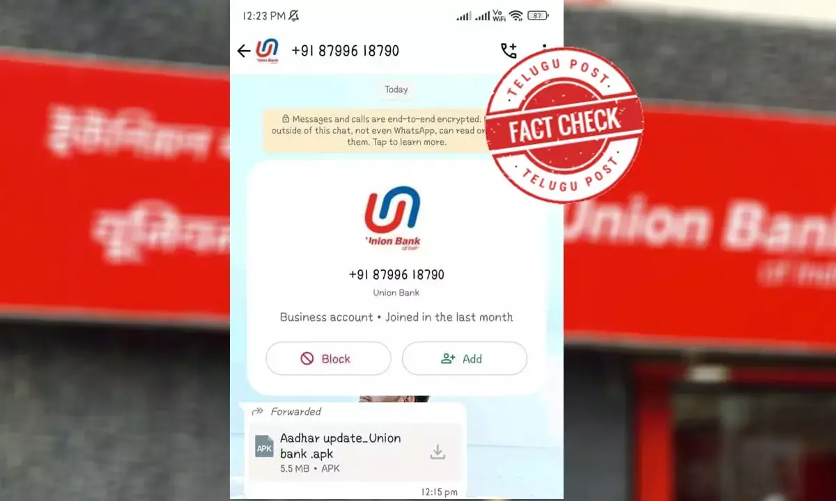 ఫ్యాక్ట్ చెక్: యూనియన్ బ్యాంకు నుండి ఆధార్ అప్డేట్ అంటూ వచ్చే APK ఫైల్ ను ఎట్టిపరిస్థితుల్లోనూ ఇన్స్టాల్ చేయకండి.