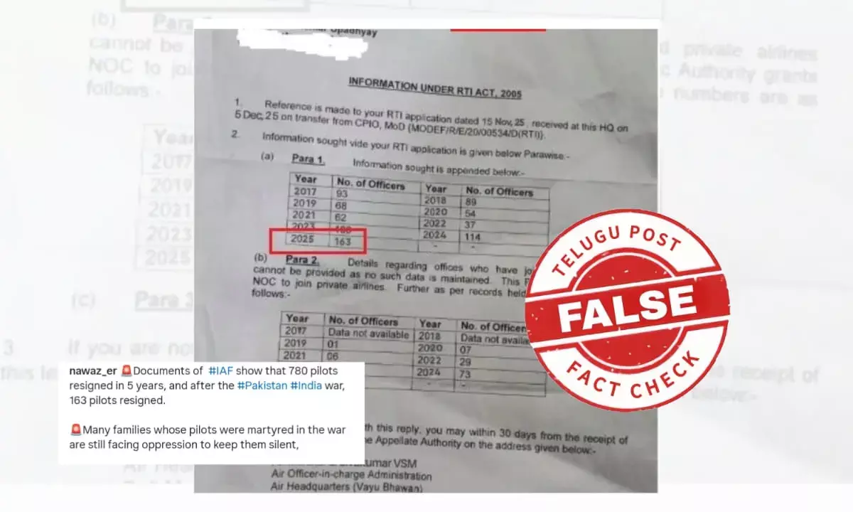 అఫీషియల్ పత్రాలంటూ సోషల్ మీడియాలో కొన్ని పోస్టులు వైరల్ అయ్యాయి. 2017 నుండి 2025 వరకు భారత వైమానిక దళం అధికారుల రాజీనామాల వివరాలను కలిగి ఉన్న పత్రం అంటూ ప్రచారం చేస్తున్నారు. భారత వైమానిక దళం (IAF) నుండి సమాచార హక్కు (RTI) ప్రతిస్పందనగా చెప్పుకునే ఒక పోస్ట్ ఆన్లైన్లో వైరల్ అవుతూ ఉంది.