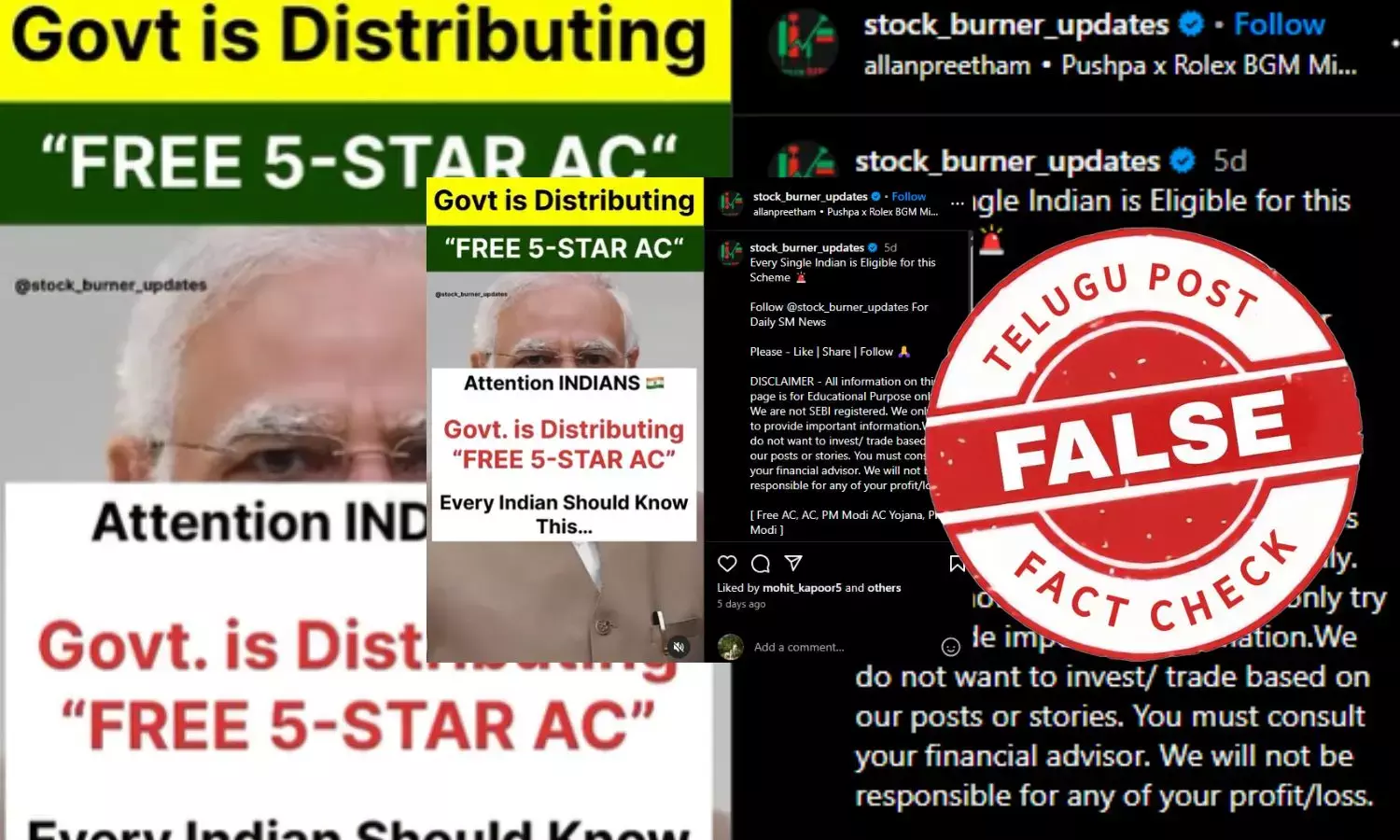 'పీఎం మోడీ ఏసీ యోజన 2025' పథకం కింద ఉచిత 5-స్టార్ ఏసీలను మారుస్తున్నట్లు సోషల్ మీడియాలో వైరల్ అవుతున్న పోస్టుల్లో ఎలాంటి నిజం లేదు. సోషల్ మీడియాలో ఇటువంటి తప్పుదారి పట్టించే పోస్ట్లకు నమ్మకండి, జాగ్రత్తగా ఉండాలి.