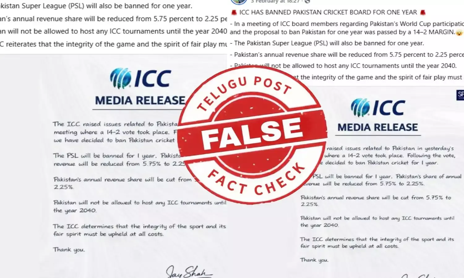 ఫ్యాక్ట్ చెకింగ్: ఐసీసీ పాకిస్థాన్ క్రికెట్ బోర్డును ఒక సంవత్సరం పాటూ బ్యాన్ చేసిందంటూ జరుగుతున్న ప్రచారంలో నిజం లేదు