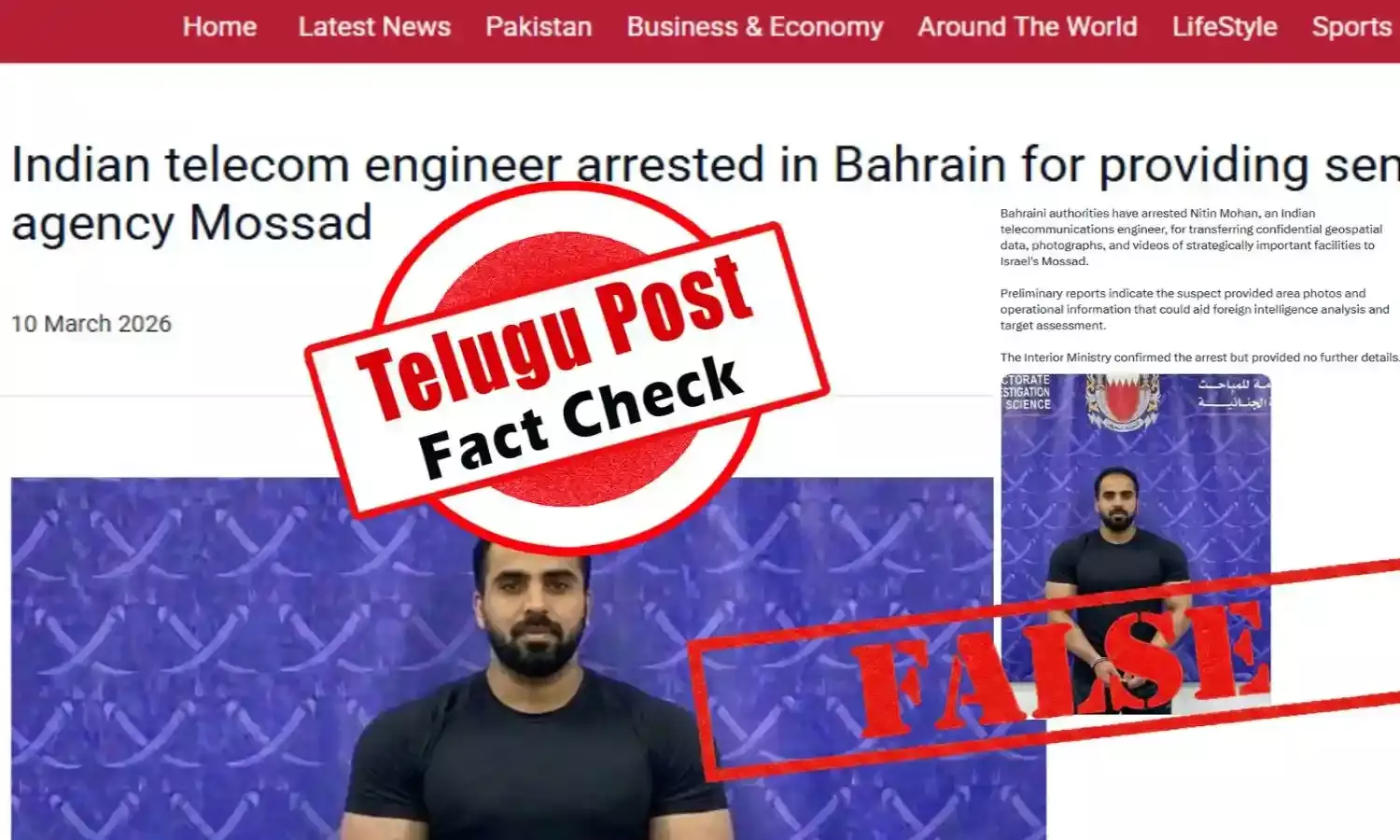 అయితే మొసాద్ కోసం గూఢచర్యం చేశాడన్న ఆరోపణలపై బహ్రెయిన్ అధికారులు ఒక భారత జాతీయుడిని అరెస్టు చేశారనే వాదనతో కొన్ని పోస్టులను సోషల్ మీడియాలో వైరల్ చేశారు. నిందితుడిని నితిన్ మోహన్గా గుర్తించారు, వృత్తిరీత్యా అతను టెలికమ్యూనికేషన్స్ ఇంజనీర్ అని అతను మొస్సాద్కు సున్నితమైన సమాచారాన్ని అందించినట్లు ఆ పోస్టుల్లో ఆరోపణలు గుప్పించారు. నిందితుడు అనేక ముఖ్యమైన, వ్యూహాత్మక ప్రదేశాల వివరాలు కలిగిన భౌగోళిక సమాచారం, ఫోటోలు, వీడియోలను పంచుకున్నాడని ఆ పోస్టుల్లో తెలిపారు. దర్యాప్తు కొనసాగుతోందని, మరిన్ని వాస్తవాలు వెలుగులోకి వచ్చిన తర్వాత ప్రజలకు మరింత సమాచారం విడుదల చేయబడుతుందని వైరల్ పోస్టుల్లో తెలిపారు.