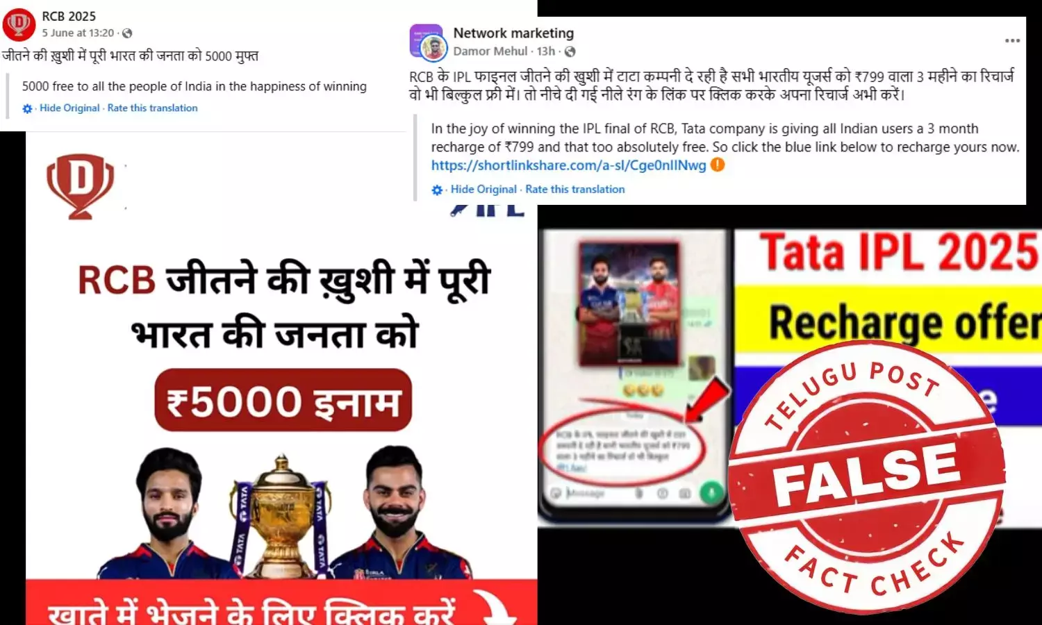 రాయల్ ఛాలెంజర్స్ బెంగళూరు జట్టు ఐపీఎల్ ఫైనల్ లో గెలిచినందుకు అకౌంట్లలోకి 5000 రూపాయలు డబ్బులు, 799 రూపాయల రీఛార్జ్ చేస్తున్నట్లుగా జరుగుతున్న ప్రచారంలో ఎలాంటి నిజం లేదు.