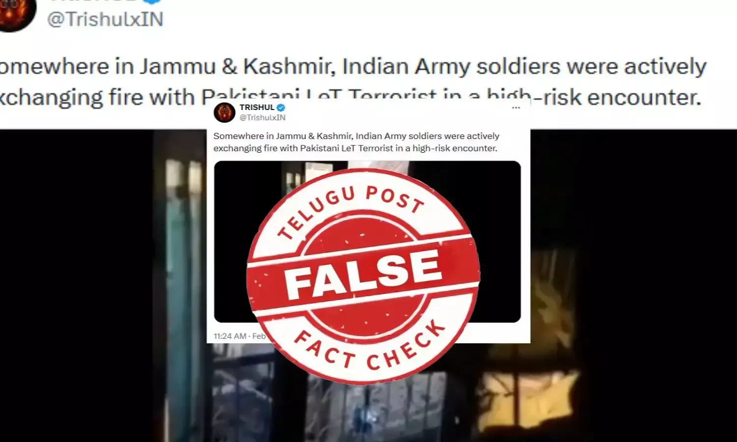 2026 లో జమ్మూ కశ్మీర్లో యుద్ధం లాంటి పరిస్థితి కొనసాగుతుందనే వాదనతో భారత ఆర్మీ సిబ్బంది ఉగ్రవాదులతో సాగిస్తున్న పోరాటం అంటూ చూపించే ఒక వీడియో సోషల్ మీడియాలో విస్తృతంగా వైరల్ అవుతోంది. ఒక గదిలో ఉన్న సాయుధ సైనికులు కిటికీ నుండి బయట ఉన్న వ్యక్తులపై కాల్పులు జరుపుతున్నట్లు ఫుటేజ్లో ఉంది. వైరల్ పోస్టులకు సంబంధించిన ఆర్కైవ్ లింక్స్ ఇక్కడ ఉంది.