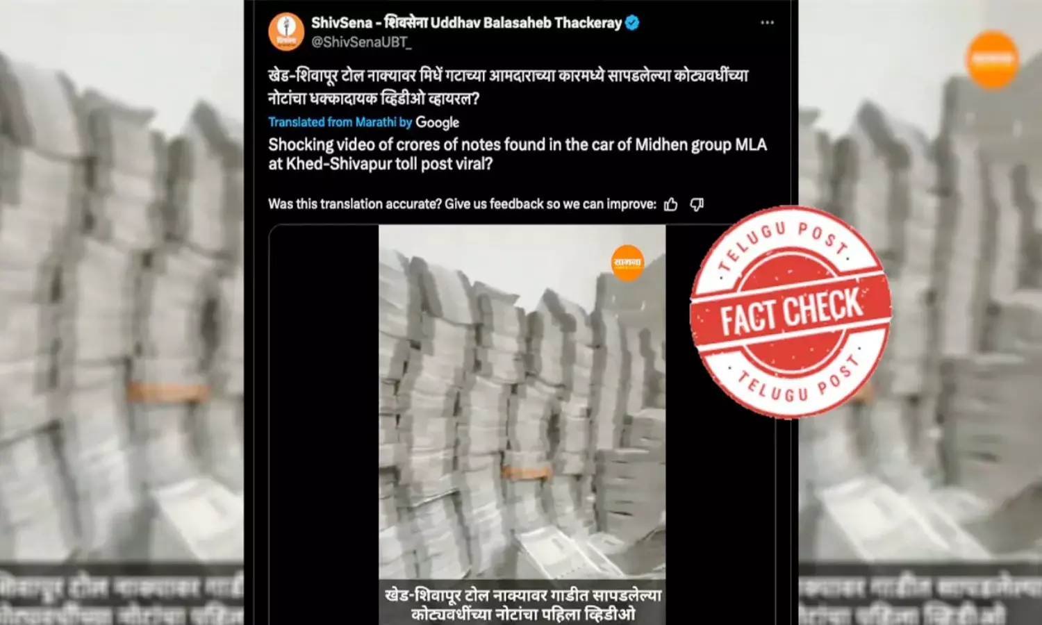 'ఖేడ్-శివాపూర్ టోల్ పోస్ట్ వద్ద ఎమ్మెల్యే కారులో కోట్ల విలువైన నోట్లు దొరికిన షాకింగ్ వీడియో వైరల్?' అంటూ ShivSena - शिवसेना Uddhav Balasaheb Thackeray ట్విట్టర్ ఖాతాలో పోస్టు పెట్టారు.
