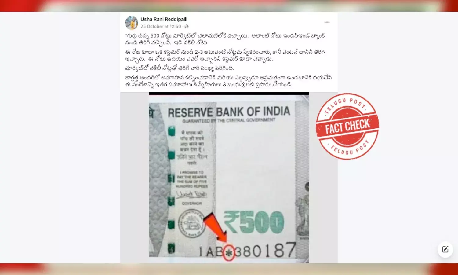 "*గుర్తు ఉన్న 500 నోట్లు మార్కెట్లో చలామణిలోకి వచ్చాయి. అలాంటి నోటు ఇండస్ఇండ్ బ్యాంక్ నుండి తిరిగి వచ్చింది. ఇది నకిలీ నోటు.