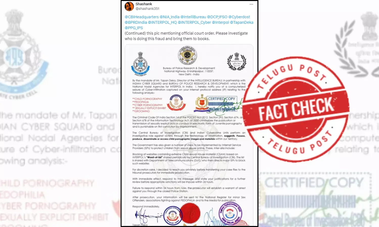 సైబర్ సెల్ ఇండియా, ఇంటెలిజెన్స్ బ్యూరో మొదలైన వాటి లోగోలు ఉన్న ఒక లేఖ సోషల్ మీడియాలో సర్క్యులేషన్లో ఉంది, చాలా మంది వినియోగదారులు ఆ లేఖ నిజమైనదా కాదా అని అడుగుతున్నారు. సీబీఐ, ఇంటెలిజెన్స్ బ్యూరో లేదా మరేదైనా ప్రభుత్వ సంస్థ అలాంటి లేఖను జారీ చేసిందా అని తెలుసుకోడానికి ప్రయత్నిస్తున్నారు. లేఖ జారీ చేసిన వ్యక్తి IP చిరునామాను సైబర్ క్రైమ్ అధికారులు చూస్తున్నారని లేఖ పేర్కొంది. పిల్లల అశ్లీల, పెడోఫిలిక్ వీడియోలను డౌన్లోడ్ చేయడం, చూడటం వంటి పనులు చేస్తున్న వ్యక్తుల IP అడ్రెస్ క్యాప్చర్ చేశారని ఆ లేఖలో ఉంది. 24 గంటలలోపు లేఖకు తక్షణమే ప్రతిస్పందించాలని.. అలా స్పందించడంలో విఫలమైతే, స్థానిక పోలీస్ స్టేషన్లో అరెస్ట్ వారెంట్ను జారీ చేస్తారు. ఈ లేఖపై ఇంటెలిజెన్స్ బ్యూరో డైరెక్టర్ తపన్ దేకా, శ్రీ ప్రశాంత్ గౌతమ్ పోలీస్/చీఫ్ ఆఫ్ పోలీస్ సంతకం చేసినట్లు ఉంది.