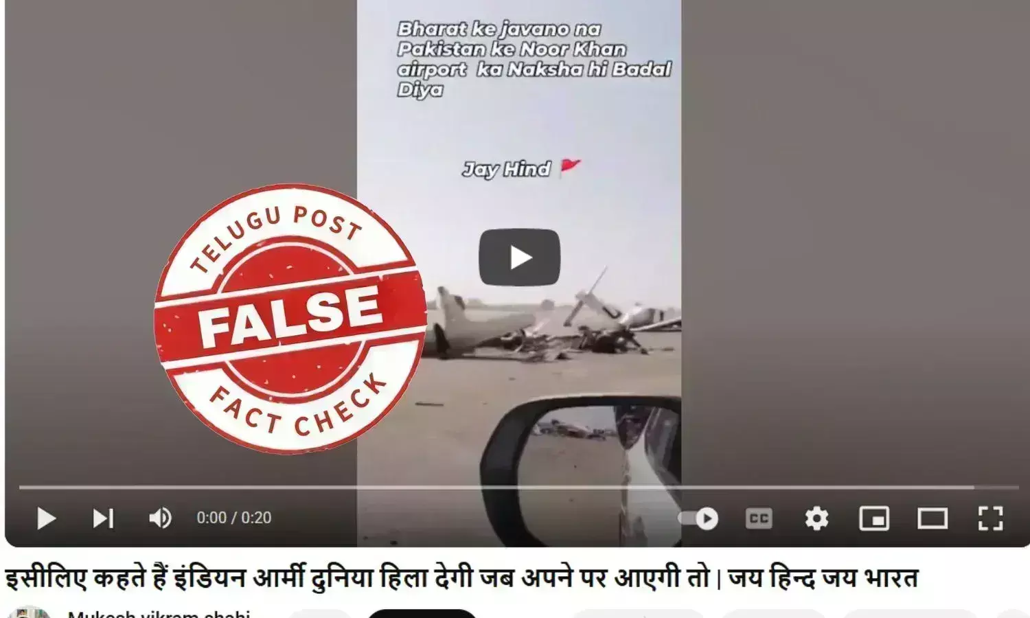 అయితే, రన్వేపై దెబ్బతిన్న విమానాలను చూపిస్తూ, విమానాశ్రయం మీద వాహనం ముందుకు వెళుతున్న ఒక వీడియో సోషల్ మీడియా లో వైరల్ అవుతోంది. ఈ వీడియో భారత సాయుధ దళాల దాడుల వల్ల ధ్వంసమైన పాకిస్తాన్లోని నూర్ ఖాన్ విమానాశ్రయాన్ని చూపిస్తుందని ప్రచారం చేస్తున్నారు. “భారత్ కే జవానో నే పాకిస్తాన్ కే నూర్ ఖాన్ విమానాశ్రయం కే నక్షా హి బాదల్ దియా” అనే టెక్స్ట్ వీడియో మీద ఉంది. భారత్ కు చెందిన జవాన్లు నూర్ ఖాన్ విమానాశ్రయం రూపు రేఖలను మార్చేశారని అర్థం వస్తుంది.