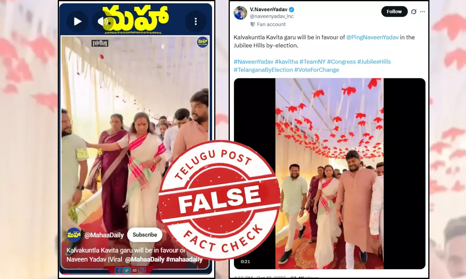 నవీన్ యాదవ్ అభిమాని ఖాతా అని చెప్పుకునే X ఖాతాలో కల్వకుంట్ల కవిత నవీన్ యాదవ్ కు అనుకూలంగా ఉన్నారనే క్యాప్షన్తో వీడియోను షేర్ చేశారు. "#NaveenYadav #kavitha #TeamNY #Congress #JubileeHills #TelanganaByElection #VoteForChange” అనే హ్యాష్ ట్యాగ్స్ తో పోస్టులు పెట్టారు