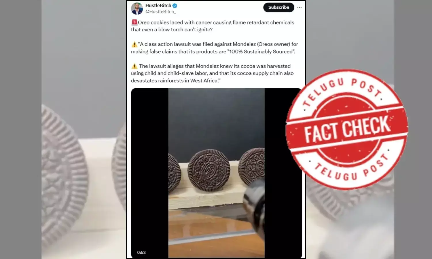 ఈ వీడియో Xలో వైరల్ అవుతోంది. ఓరియో కుక్కీలలో క్యాన్సర్కు కారణమయ్యే రసాయనాలను ఉపయోగిస్తూ ఉన్నారని, భారీ టెంపరేచర్ లో కూడా వాటిని మండించలేమా? ఈ ఉత్పత్తులు తప్పుడు వాదనలతో ప్రజలను మోసం చేస్తున్నాయి. ఈ పని చేస్తున్నందుకు మోండెలెజ్ (ఓరియో యజమాని)పై క్లాస్ యాక్షన్ వ్యాజ్యం దాఖలు చేశారని వాదనలో ఆరోపించారు. ఓరియో తయారీలో ఉపయోగించే కోకోవాను బాలకార్మికులను ఉపయోగించి తీసుకుని వస్తున్నారని, ఈ గొలుసు పశ్చిమ ఆఫ్రికాలోని వర్షారణ్యాలను కూడా నాశనం చేస్తున్నాయని వైరల్ క్లెయిమ్ లో ఆరోపించారు.