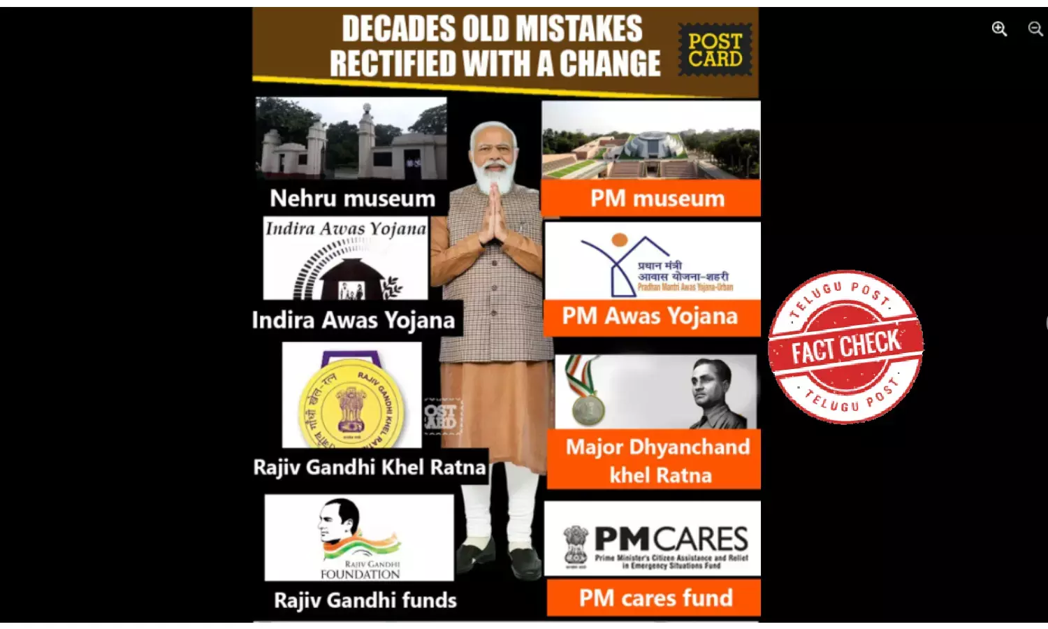 నరేంద్ర మోదీ నేతృత్వంలోని కేంద్ర ప్రభుత్వం తిరిగి పేరు పెట్టి ప్రజల్లోకి వదిలిన పథకాలు, స్థలాలు, సంస్థలు, అవార్డులకు సంబంధించిన వివరాలంటూ సోషల్ మీడియాలో వైరల్ అయ్యాయి. నెహ్రూ మ్యూజియం PM మ్యూజియంగా, ఇందిరా ఆవాస్ యోజనను ప్రధాన మంత్రి ఆవాస్ యోజనగా, రాజీవ్ గాంధీ ఖేల్ రత్న మేజర్ ధ్యాన్ చంద్ ఖేల్ రత్నగా మార్చబడింది, రాజీవ్ గాంధీ ఫౌండేషన్ ను PM కేర్స్ గా మార్చారంటూ పోస్టులు వైరల్ అవుతున్నాయి.