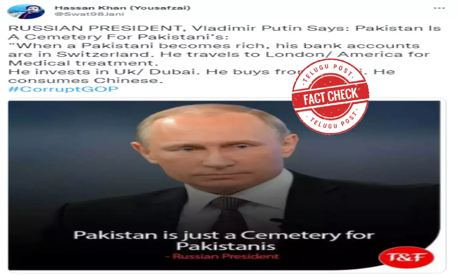రష్యా అధ్యక్షుడు వ్లాదిమిర్ పుతిన్ చెప్పినట్లుగా.. ఓ కోట్ సోషల్ మీడియాలో విస్తృతంగా షేర్ చేయబడుతోంది. అది కూడా పాకిస్థాన్ పై తీవ్ర వ్యాఖ్యలు చేసినట్లుగా పోస్టుల ద్వారా ప్రచారం చేస్తూ ఉన్నారు. పుతిన్ పాకిస్థాన్ను స్మశానవాటికగా ఉపయోగించే భూమిగా అభివర్ణించాడన్నది వైరల్ పోస్టుల్లో ఉన్నది. పాకిస్తాన్లోని ధనవంతులు పాకిస్థాన్ భూభాగాన్ని స్మశానవాటికలా మాత్రమే ఎలా ఉపయోగించుకుంటున్నారనే అర్థం వచ్చేలా ఈ వ్యాఖ్యలు ఉన్నాయి.