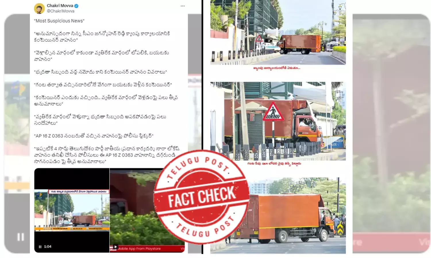 ఫ్యాక్ట్ చెక్: ఏపీ సీఎం క్యాంపు కార్యాలయానికి అనుమానాస్పద కంటెయినర్ వాహనం వెళ్ళిందంటూ జరుగుతున్న ప్రచారంలో నిజం లేదు.