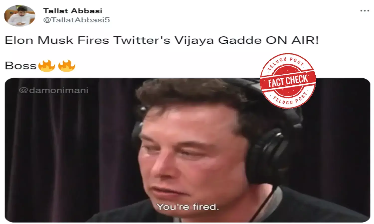 ఎలోన్ మస్క్ ఒక షోలో విజయ గద్దెను ఉద్యోగం నుంచి తొలగించారంటూ ఒక వీడియో సోషల్ మీడియాలో వైరల్ అవుతోంది.