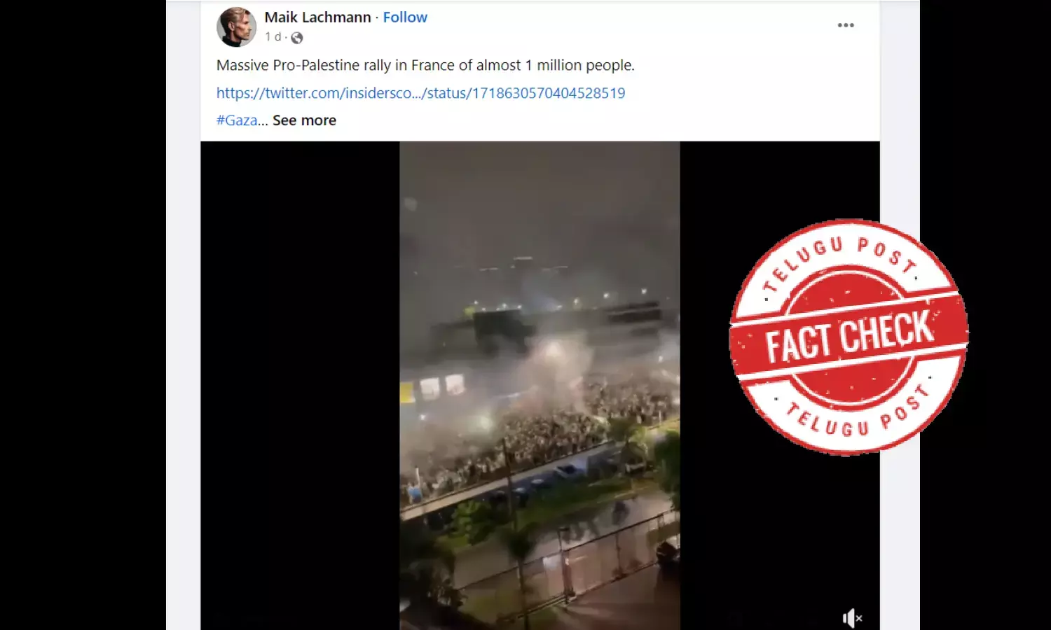 ఇంతలో, ఫ్రాన్స్లో జరిగిన భారీ పాలస్తీనా అనుకూల ర్యాలీ అంటూ ఒక వీధిలో భారీ జనసమూహం కవాతు చేస్తున్న వీడియోను సోషల్ మీడియాలో షేర్ చేస్తున్నారు కొందరు. చుట్టూ ఫ్లాష్లైట్లతో లక్షలాది మంది వీధుల్లో కవాతు చేస్తున్న దృశ్యాలు ఈ వీడియోలో చూడవచ్చు.