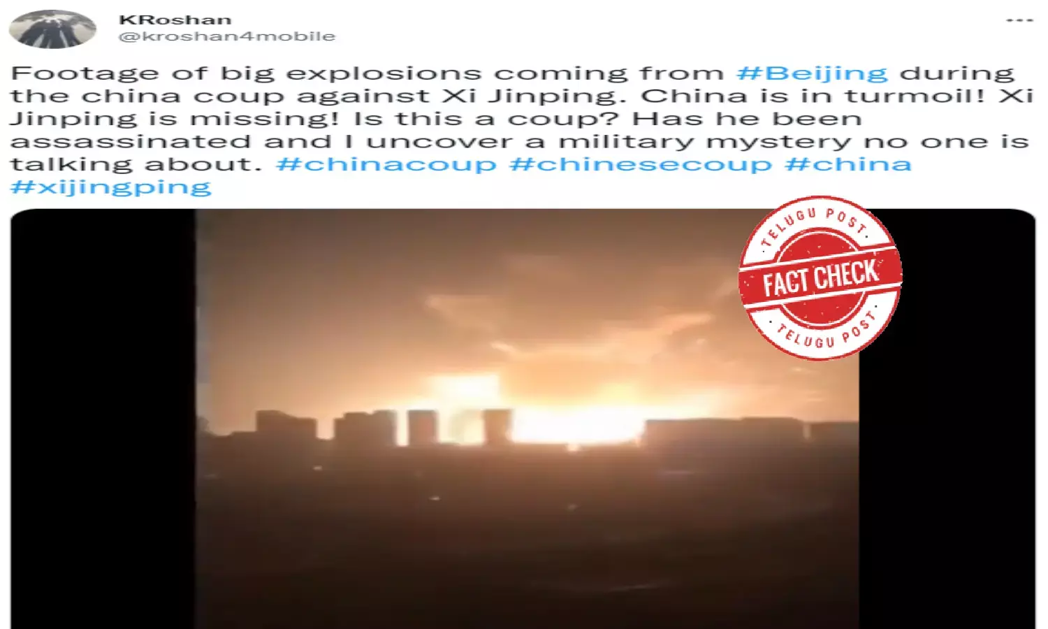 అదే సమయంలో, సైనిక తిరుగుబాటుకు సంబంధించి బీజింగ్ లో భారీ పేలుడు జరిగిందంటూ ఒక వీడియో ప్రచారంలో ఉంది. "జిన్పింగ్పై చైనా తిరుగుబాటు సమయంలో #బీజింగ్ నుండి వస్తున్న పెద్ద పేలుళ్ల ఫుటేజీ. చైనా అల్లకల్లోలం! జింపింగ్ కనపడుట లేదు! ఇదేనా తిరుగుబాటు? అతను హత్యకు గురయ్యాడా మరియు ఎవరూ మాట్లాడని సైనిక రహస్యాన్ని నేను వెలికితీస్తాను. #chinacoup #chinesecoup #china #xijingping" " అనే శీర్షికతో వీడియో వైరల్గా షేర్ అవుతోంది