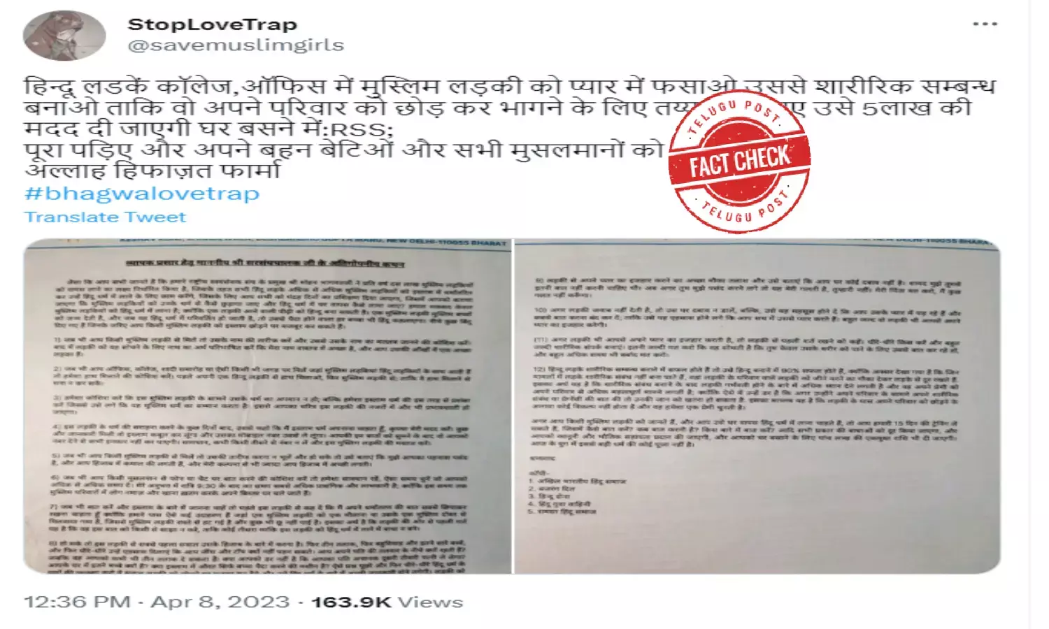 ముస్లిం మహిళలను ప్రేమించి వారిని హిందూ మతంలోకి మార్చమని హిందూ పురుషులను ప్రోత్సహిస్తూ ఆర్ఎస్ఎస్ లేఖలు జారీ చేసింది అనే కథనంతో రెండు చిత్రాలు సోషల్ మీడియాలో వైరల్ అవుతున్నాయిముస్లిం యువతులను ఎలా ట్రాప్ చేయాలో తెలుపుతూ 12 పాయింట్లను వివరించారంటూ పోస్టులు పెట్టారు. హిందూ అబ్బాయిలు ప్రతి సంవత్సరం 10 లక్షల మంది ముస్లిం అమ్మాయిలను తిరిగి హిందూమతంలోకి తీసుకురావాల్సిన అవసరం ఉందని, మరిన్ని వివరాలను తెలుసుకోడానికి 15 రోజుల శిక్షణా కార్యక్రమానికి హాజరు కావాలని లేఖలో పేర్కొన్నారు.చాలా మంది సోషల్ మీడియా వినియోగదారులు ఈ లేఖను #bhagwalovetrap #islamophobia మొదలైన హ్యాష్ట్యాగ్లతో షేర్ చేశారు. వినియోగదారులు ముస్లిం మహిళలను సోషల్ మీడియాలో హెచ్చరించారు.- మీరు ఒక ముస్లిం అమ్మాయిని కలిసినప్పుడు, గొప్ప వ్యక్తిత్వం ఉన్న మంచి వ్యక్తిగా నటించండి- ముస్లిం అమ్మాయిలతో ఎప్పుడూ కరచాలనం చేయండి- వారి ధర్మాన్ని అవమానించకుండా ప్రయత్నించండి, వారి ముందు ఇస్లాంను ప్రశంసించండి- మీరు ఆమెను కలిసినప్పుడు, ఆమె హిజాబ్ను ప్రశంసించండిలేఖలో ఇలాంటి మరిన్ని అంశాలు ఉన్నాయి.