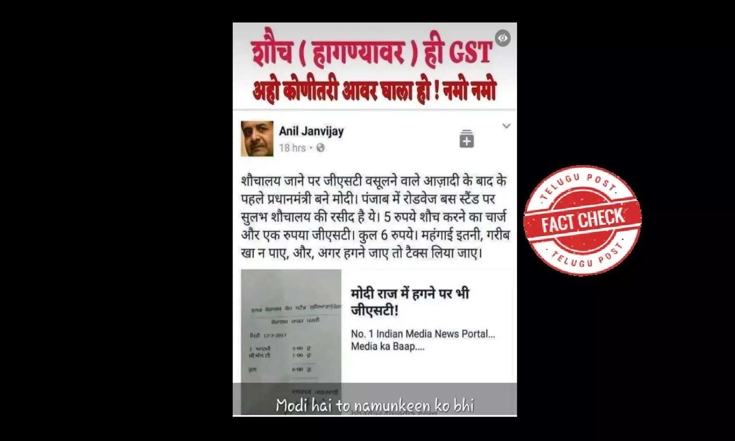 పబ్లిక్ టాయిలెట్లపై ప్రభుత్వం వస్తు సేవల పన్ను (జీఎస్టీ) విధించిందని ఫేస్బుక్లో ఓ పోస్ట్ వైరల్ గా మారింది. వైరల్ పోస్ట్ పంజాబ్ ప్రభుత్వ బస్టాండ్లోని పబ్లిక్ టాయిలెట్ ఉపయోగించినందుకు GST విధిస్తున్నారని అందులో ఉంది. టాయిలెట్ ను వాడుకున్నందుకు 5 రూపాయలు కాకుండా.. అదనంగా ఒక రూపాయిని జీఎస్టీ కింద చూపుతున్నట్లు రసీదులో ఉందని చెబుతూ ఉన్నారు. ఈ రసీదుకు సంబంధించిన ఫోటోను వైరల్ చేస్తూ ఉన్నారు
