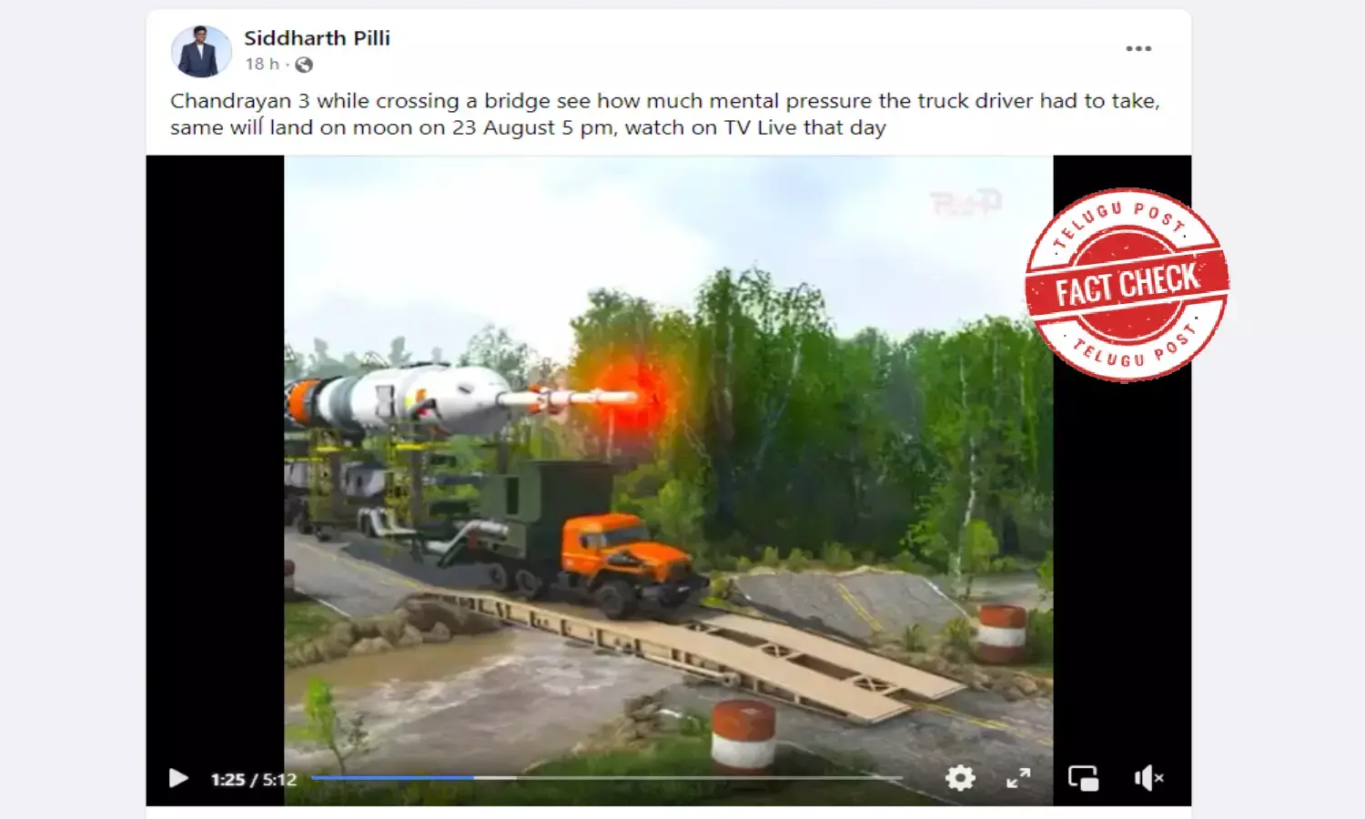 అందువల్ల, భారీ ట్రక్కు రాకెట్ను మోస్తూ ఇరుకైన వంతెన గుండా వెళుతున్న వైరల్ వీడియో “స్పిన్టైర్స్: మడ్రన్నర్” అనే వీడియో గేమ్లోని క్లిప్పింగ్ మాత్రమే..! ఇది చంద్రయాన్-3కి సంబంధించినది కాదు. వైరల్ అవుతున్న వాదనలో ఎలాంటి నిజం లేదు.