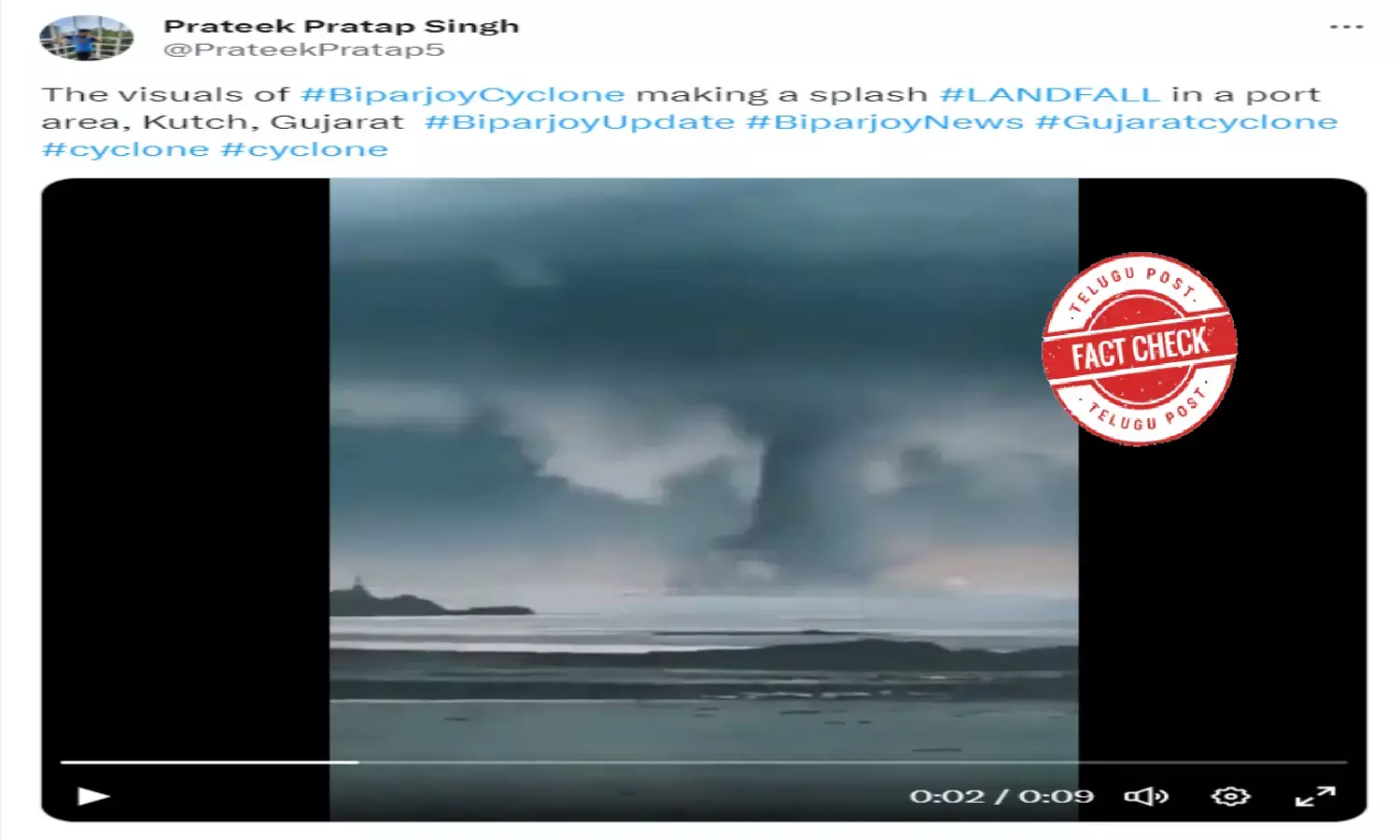 ఆ సమయంలో సముద్ర తీరంలో సుడిగాలి కనిపించిందని.. గుజరాత్లోని కచ్ ఓడరేవు ప్రాంతంలో బిపార్జోయ్ తుఫాను తీరాన్ని తాకుతున్న దృశ్యాలు ఇవని చెబుతూ వైరల్ పోస్టుల్లో పేర్కొన్నారు.