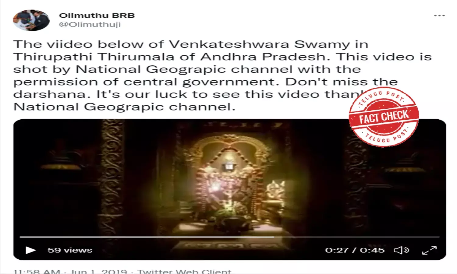 ఆ క్లెయిమ్ "ఆంధ్రప్రదేశ్ లోని తిరుపతి తిరుమలలో వేంకటేశ్వర స్వామి. కేంద్ర ప్రభుత్వ అనుమతితో నేషనల్ జియోగ్రాఫిక్ ఛానల్ ఈ వీడియోను చిత్రీకరించింది. దర్శనాన్ని కోల్పోకండి" అంటూ పంచుకోబడుతోంది. ఈ క్లెయిమ్ సోషల్ మీడియాలోని అన్ని ప్లాట్ఫారమ్లలో ప్రచారంలో ఉంది.