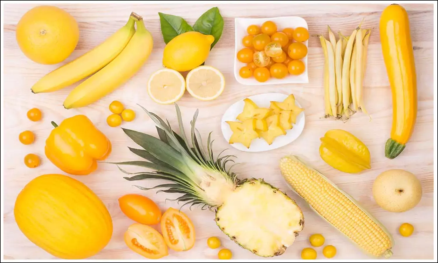 పసుపు మన కళ్లకు అత్యంత ఆహ్లాదకరమైన రంగు. ఇది తరచుగా సూర్యరశ్మి, ఆనందం రంగుగా పరిగణించబడుతుంది. పసుపు పండ్లు, కూరగాయలు తినడం వల్ల మన రోగనిరోధక శక్తి పెరుగుతుంది. ఇది మనకు మెరిసేచర్మాన్ని అందిస్తుంది. పసుపు ఆహారాలలో కెరోటినాయిడ్స్, బయోఫ్లేవనాయిడ్స్ ఉంటాయి. వీటిని యాంటీ ఆక్సిడెంట్లు కలిపితే వ్యాధులను దూరం చేస్తాయి. ఇవి ఫ్రీ రాడికల్స్ను నివారిస్తాయి. వాపును తగ్గిస్తాయి.