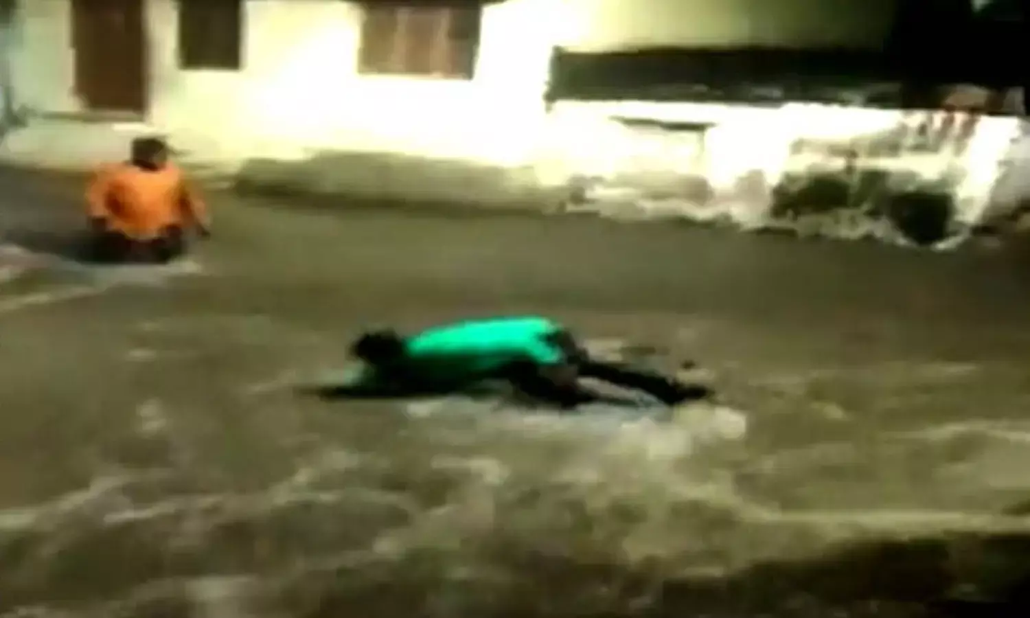 ఢిల్లీ, గురుగ్రామ్, ముంబై, బెంగళూరు నగరాల తర్వాతా హైదరాబాద్లో వరుణదేవుడు తన ఉగ్రరూపం చూపిస్తూ ఉన్నాడు. బుధవారం సాయంత్రం నుంచి ఎడతెరిపి లేకుండా కురుస్తున్న వర్షం కారణంగా నగరంలోని వీధులన్నీ వాగులుగా మారాయి. ANI షేర్ చేసిన వీడియోలో, హైదరాబాద్లోని బోరబండ ప్రాంతంలో ద్విచక్ర వాహనంతో పాటు వర్షం నీటిలో ఓ వ్యక్తి కొట్టుకుపోతూ కనిపించాడు.