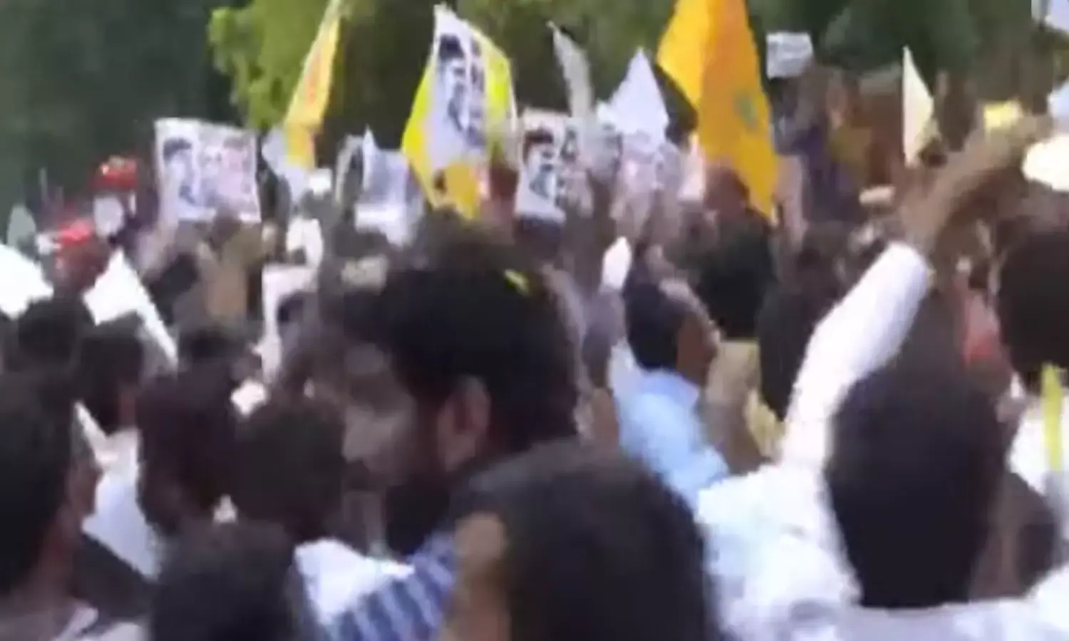 తెలుగుదేశం పార్టీ అధినేత చంద్రబాబు నాయుడు బేగంపేట్ ఎయిర్ పోర్టుకు చేరుకున్నారు. ప్రత్యేక విమానంలో చేరుకున్న ఆయనకు పార్టీ కార్యకర్తలు, అభిమానులు పెద్దయెత్తున స్వాగతం పలికారు. జై బాబు అంటూ నినాదాలతో బేగంపేట పరిసర ప్రాంతాలన్నీ దద్దరిల్లి పోయాయి. హైదరాబాద్ లో ఉన్న ఆయన అభిమానులంతా వచ్చి చంద్రబాబుకు ఘన స్వాగతం పలికారు. పూలవర్షం కురిపించారు. ఆయన కాన్వాయ్ వద్ద నిలబడి పెద్దయెత్తున నినాదాలు చేశారు.