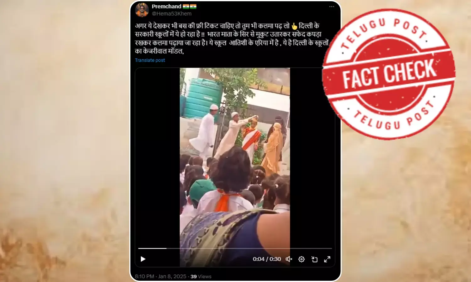 ಜನವರಿ 08, 2025ರಂದು ಪ್ರೇಮ್ಚಂದ್ ಎಂಬ ಎಕ್ಸ್ ಖಾತೆರಾರರೊಬ್ಬರು ವಿಡಿಯೋವನ್ನು ಹಂಚಿಕೊಂಡು ʼअगर ये देखकर भी बस की फ्री टिकट चाहिए तो तुम भी कलमा पढ़ लो 👆दिल्ली के सरकारी स्कूलों में ये हो रहा है !! भारत माता के सिर से मुकुट उतारकर सफेद कपड़ा रखकर कलमा पढ़ाया जा रहा है। ये स्कूल आतिशी के एरिया में है , ये है दिल्ली के स्कूलों का केजरीवाल मॉडल,ʼ ಎಂಬ ಶೀರ್ಷಿಕೆಯೊಂದಿಗೆ ಹಂಚಿಕೊಂಡಿದ್ದಾರೆ. ಶೀರ್ಷಿಕೆಯನ್ನು ಕನ್ನಡಕ್ಕೆ ಅನುವಾದಿಸಿದಾಗ ʼಇದನ್ನು ನೋಡಿದ ಮೇಲೂ ನಿಮಗೆ ಉಚಿತ ಬಸ್ ಟಿಕೆಟ್ ಬೇಕಿದ್ದರೆ ನೀವೂ ಕಲ್ಮವನ್ನು ಪಠಿಸಬೇಕು. ದೆಹಲಿಯ ಸರ್ಕಾರಿ ಶಾಲೆಗಳಲ್ಲಿ ಹೀಗಾಗುತ್ತಿದೆ. ಭಾರತ ಮಾತೆಯ ತಲೆಯ ಮೇಲಿನ ಕಿರೀಟವನ್ನು ತೆಗೆದು ಬಿಳಿ ಬಟ್ಟೆಯನ್ನು ಇಟ್ಟು ಕಲ್ಮ ಕಲಿಸಲಾಗುತ್ತಿದೆ. ಈ ಶಾಲೆಯು ಅತಿಶಿ ಎಂಬ ಪ್ರದೇಶದಲ್ಲಿದೆ, ಇದು ದೆಹಲಿಯಲ್ಲಿರುವ ಕೇಜ್ರಿವಾಲ್ ಶಾಲೆಗಳ ಮಾದರಿʼ ಎಂದು ಬರೆದು ಪೊಸ್ಟ್ ಮಾಡಿರುವುದನ್ನು ನಾವಿಲ್ಲಿ ನೋಡಬಹುದು.