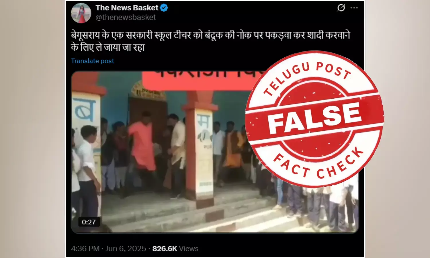 ಜೂನ್ 06, 2025ರಂದು ಎಕ್ಸ್ ಖಾತೆದಾರರೊಬ್ಬರು ʼबेगूसराय के एक सरकारी स्कूल टीचर को बंदूक की नोक पर पकड़वा कर शादी करवाने के लिए ले जाया जा रहाʼ ಎಂಬ ಶೀರ್ಷಿಕೆಯೊಂದಿಗೆ ವಿಡಿಯೋವನ್ನು ಹಂಚಿಕೊಂಡಿದ್ದಾರೆ. ಶೀರ್ಷಿಕೆಯನ್ನು ಕನ್ನಡಕ್ಕೆ ಅನುವಾದಿಸಿದಾಗ ʼಬೇಗುಸರಾಯ್ನ ಸರ್ಕಾರಿ ಶಾಲಾ ಶಿಕ್ಷಕಿಯೊಬ್ಬರನ್ನು ಬಂದೂಕಿನಿಂದ ಹಿಡಿದು ಮದುವೆಗೆ ಕರೆದೊಯ್ಯಲಾಗುತ್ತಿದೆʼ ಎಂದು ಬರೆದಿರುವುದನ್ನು ನೋಡಬಹುದು.