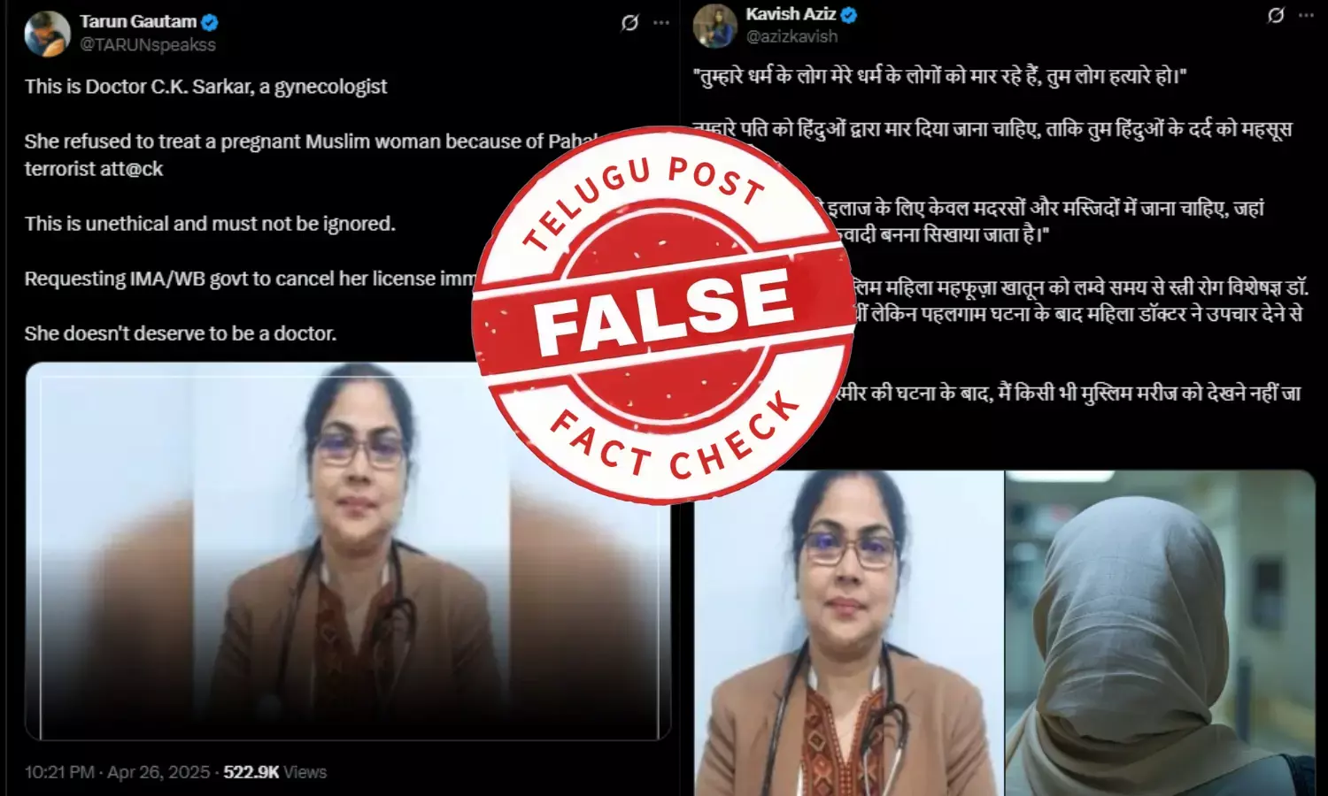 ಏಪ್ರಿಲ್ 27,2025ರಂದು ಎಕ್ಸ್ ಬಳಕೆದಾರರೊಬ್ಬರು ʼ"तुम्हारे धर्म के लोग मेरे धर्म के लोगों को मार रहे हैं, तुम लोग हत्यारे हो।. तुम्हारे पति को हिंदुओं द्वारा मार दिया जाना चाहिए, ताकि तुम हिंदुओं के दर्द को महसूस कर सको. तुम लोगों को अपने इलाज के लिए केवल मदरसों और मस्जिदों में जाना चाहिए, जहां मुसलमानों को आतंकवादी बनना सिखाया जाता है।" कोलकाता गर्भवती मुस्लिम महिला महफूज़ा खातून को लम्वे समय से स्त्री रोग विशेषज्ञ डॉ. सीके सरकार देख रही थीं लेकिन पहलगाम घटना के बाद महिला डॉक्टर ने उपचार देने से इनकार कर दिया। डॉक्टर ने कहा, "कश्मीर की घटना के बाद, मैं किसी भी मुस्लिम मरीज को देखने नहीं जा रही हूँ," ಎಂಬ ಶೀರ್ಷಿಕೆಯೊಂದಿಗೆ ಪೊಸ್ಟ್ ಮಾಡಿದ್ದಾರೆ. ಶೀರ್ಷಿಕೆಯನ್ನು ಕನ್ನಡಕ್ಕೆ ಅನುವಾದಿಸಿದಾಗ ʼ"ನಿಮ್ಮ ಧರ್ಮದ ಜನರು ನನ್ನ ಧರ್ಮದ ಜನರನ್ನು ಕೊಲ್ಲುತ್ತಿದ್ದಾರೆ, ನೀವು ಕೊಲೆಗಾರರು. ನಿಮ್ಮ ಗಂಡನನ್ನು ಹಿಂದೂಗಳೇ ಕೊಲ್ಲಬೇಕು, ಇದರಿಂದ ನೀವು ಹಿಂದೂಗಳ ನೋವನ್ನು ಅನುಭವಿಸಬಹುದು. ನೀವು ಚಿಕಿತ್ಸೆಗಾಗಿ ಮದರಸಾಗಳು ಮತ್ತು ಮಸೀದಿಗಳಿಗೆ ಮಾತ್ರ ಹೋಗಬೇಕು, ಅಲ್ಲಿ ಮುಸ್ಲಿಮರನ್ನು ಭಯೋತ್ಪಾದಕರಾಗಲು ಕಲಿಸಲಾಗುತ್ತದೆ. ಕೋಲ್ಕತ್ತಾದಲ್ಲಿ, ಗರ್ಭಿಣಿ ಮುಸ್ಲಿಂ ಮಹಿಳೆ ಮಹ್ಫುಜಾ ಖಾತೂನ್ ದೀರ್ಘಕಾಲದವರೆಗೆ ಸ್ತ್ರೀರೋಗತಜ್ಞ ಡಾ. ಸಿ.ಕೆ. ಸರ್ಕಾರ್ ಅವರ ಆರೈಕೆಯಲ್ಲಿದ್ದರು, ಆದರೆ ಪಹಲ್ಗಾಮ್ ಘಟನೆಯ ನಂತರ, ಮಹಿಳಾ ವೈದ್ಯರು ಚಿಕಿತ್ಸೆ ನೀಡಲು ನಿರಾಕರಿಸಿದರು. ವೈದ್ಯರು, "ಕಾಶ್ಮೀರ ಘಟನೆಯ ನಂತರ, ನಾನು ಯಾವುದೇ ಮುಸ್ಲಿಂ ರೋಗಿಗಳನ್ನು ನೋಡಲು ಹೋಗುವುದಿಲ್ಲ" ಎಂದು ಹೇಳಿದರು ಎಂದು ಶೀರ್ಷಿಕೆಯನ್ನು ನೀಡಿರುವುದನ್ನು ನೋಡಬಹುದು. (ಆರ್ಕೈವ್)