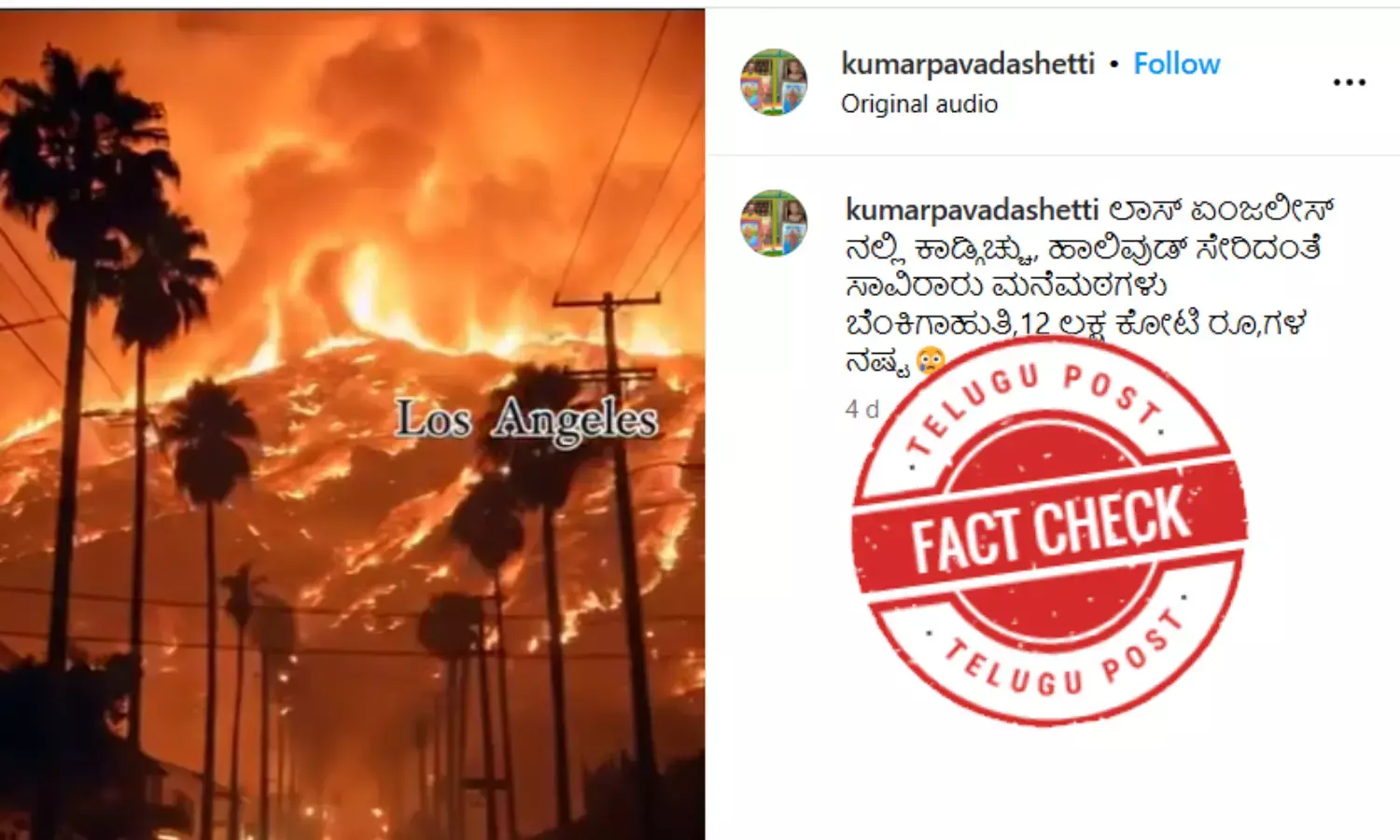 ʼಕುಮಾರ್ ಪಾವಡಾ ಶೆಟ್ಟಿʼ ಎಂಬ ಇನ್ಸ್ಟಾಗ್ರಾಮ್ ಖಾತೆದಾರ ತನ್ನ ಖಾತೆಯಲ್ಲಿ ವೈರಲ್ ಆದ ವಿಡಿಯೋವನ್ನು ಹಂಚಿಕೊಂಡು ʼಲಾಸ್ ಏಂಜಲೀಸ್ನಲ್ಲಿ ಕಾಡ್ಗಿಚ್ಚು, ಹಾಲಿವುಡ್ ಸೇರಿದಂತೆ ಸಾವಿರಾರು ಮನೆಮಠಗಳು ಬೆಂಕಿಗಾಹುತಿ,12 ಲಕ್ಷ ಕೋಟಿ ರೂ,ಗಳ ನಷ್ಟʼ ಎಂಬ ಶೀರ್ಷಿಕೆಯೊಂದಿಗೆ ಹಂಚಿಕೊಂಡಿರುವುದನ್ನು ನಾವಿಲ್ಲಿ ನೋಡಬಹುದು.