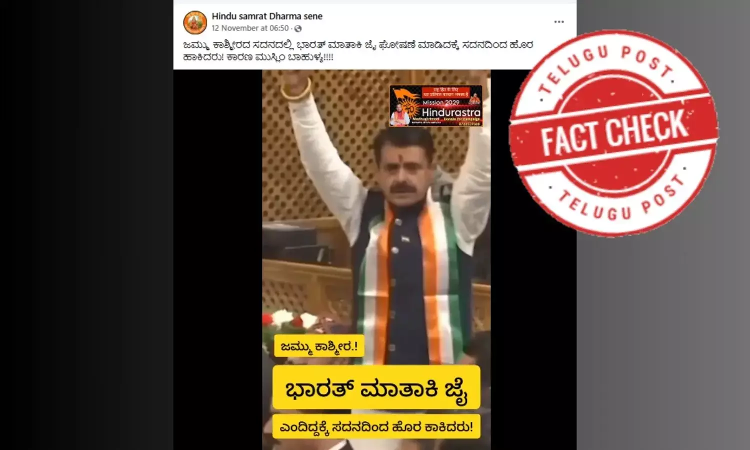 ನವಂಬರ್ 12, 2024ರಂದು ʼಹಿಂದು ಸಾಮ್ರಾಟ್ ಧರ್ಮ ಸೇನೆʼ ಫೇಸ್ಬುಕ್ನ ಖಾತೆಯಲ್ಲಿ ʼಜಮ್ಮು ಕಾಶ್ಮೀರದ ಸದನದಲ್ಲಿ ಭಾರತ್ ಮಾತಾಕಿ ಜೈ ಘೋಷಣೆ ಮಾಡಿದಕ್ಕೆ ಸದನದಿಂದ ಹೊರ ಹಾಕಿದರು! ಕಾರಣ ಮುಸ್ಲಿಂ ಬಾಹುಳ್ಯ!!!!ʼ ಎಂಬ ಶೀರ್ಷಿಕೆಯೊಂದಿಗೆ ವಿಡಿಯೋವನ್ನು ಹಂಚಿಕೊಂಡಿದ್ದಾರೆ