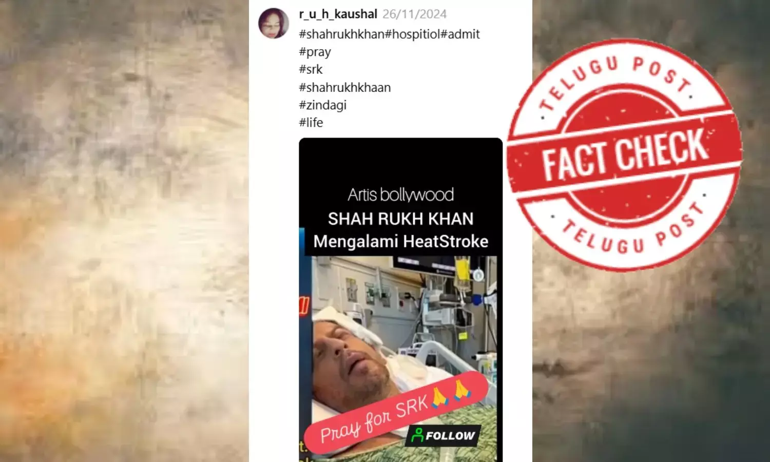 ನವಂಬರ್ 26, 2024ರಂದು ʼರೂ ಕುಶಲ್ʼ ಎಂಬ ಇನ್ಸ್ಟ್ರಾಗ್ರಾಮ್ ಖಾತೆದಾರರೊಬ್ಬರು ʼಬಾಲಿವುಡ್ನ ಮೆಗಾಸ್ಟಾರ್ ಶಾರುಖ್ ಖಾನ್ ಹೀಟ್ ಸ್ಟ್ರೋಕ್ನಿಂದಾಗಿ ಆಸ್ಪತ್ರೆಗೆ ದಾಖಲಾಗಿದ್ದಾರೆ. ಎಲ್ಲರೂ ದೇವರಲ್ಲಿ ಪ್ರಾರ್ಥಿಸಿʼ ಎಂಬ ಶೀರ್ಷಿಕೆಯೊಂದಿಗೆ ವಿಡಿಯೋವನ್ನು ಹಂಚಿಕೊಂಡಿದ್ದಾರೆ.